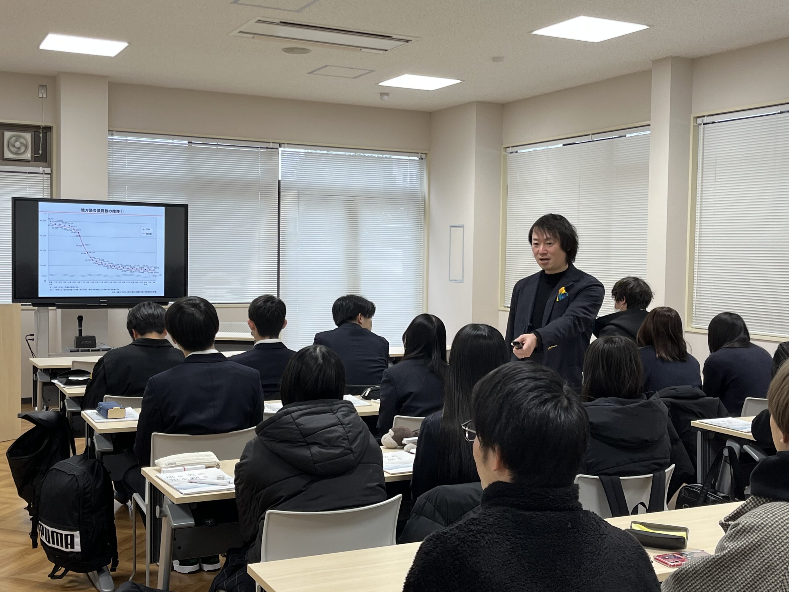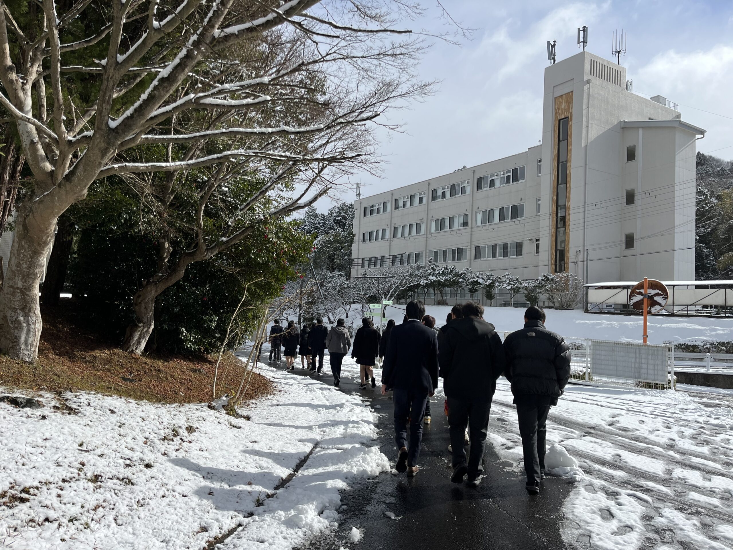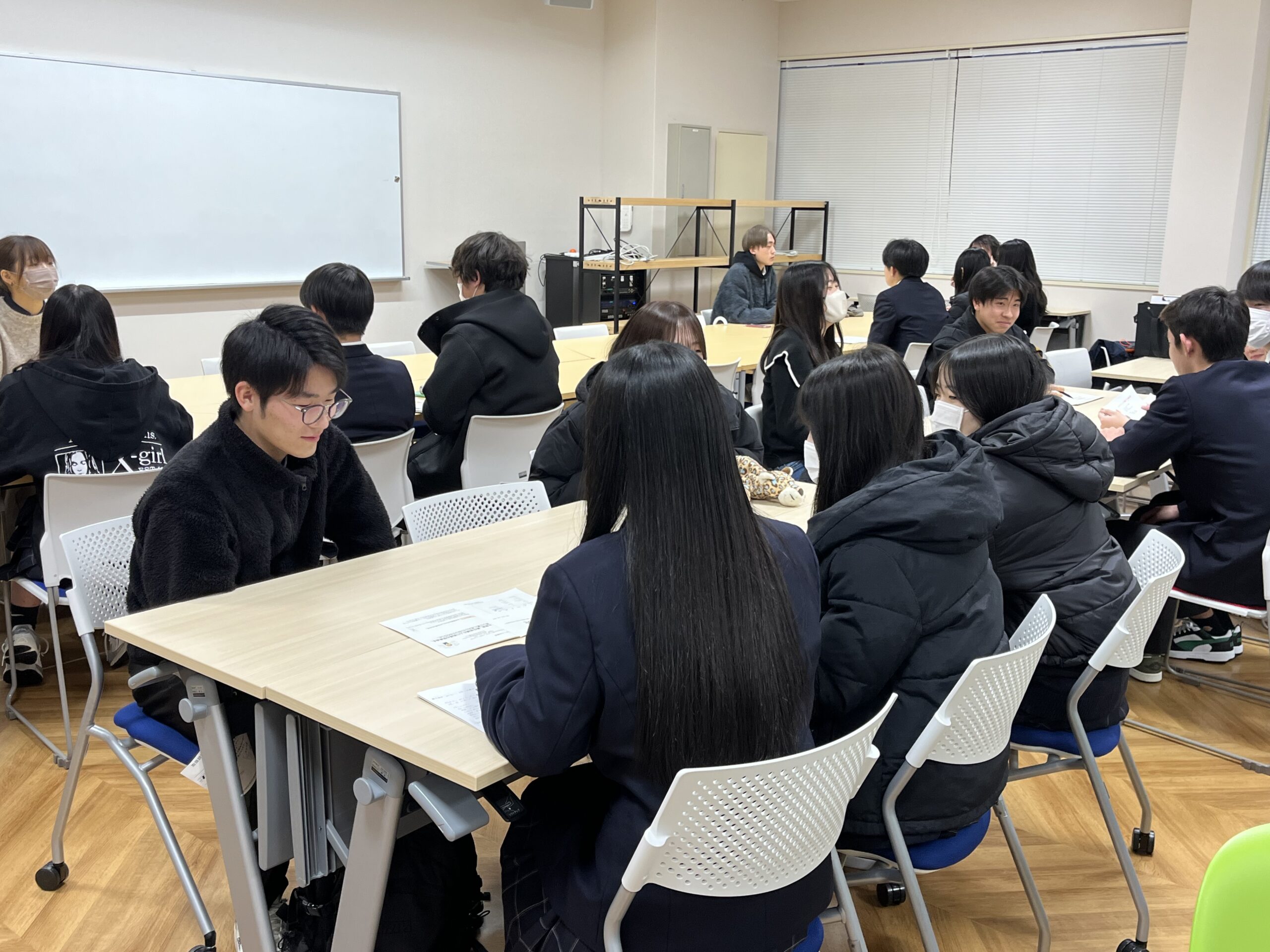 この日の福知山は今シーズン一番の寒波に見舞われましたが、施設見学の後、地域経営学部 杉岡 秀紀 准教授による模擬講義「『地域』について考えてみよう」を受講し、杉岡ゼミの学生4名と意見交換会を行いました。意見交換会では、高校の探究活動についての相談や学生生活へのさまざまな質問が飛び出し、賑やかな時間を過ごしました。