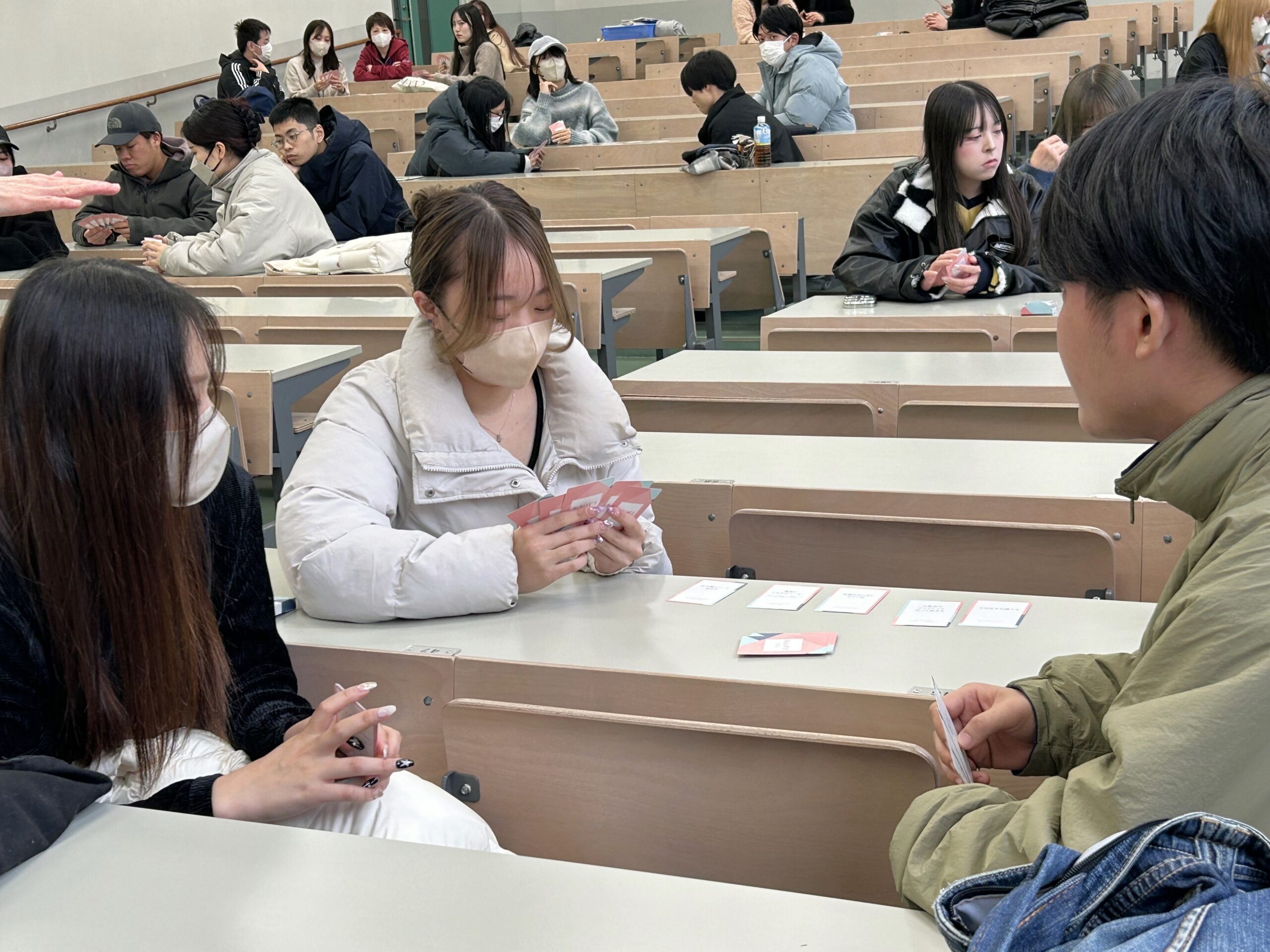 もしバナゲームは、「自分の人生の最期には何をしたいか?」と問いかけながら、トランプのようなカードに書かれた選択肢を選び、人生の価値観や看取りの際に必要なこととは何かを考え学ぶゲームです。当日は、地域経営学部の2年生から4年生までの約40人の学生が1グループ4人ずつに分かれ、もしバナゲームを行いました。学生からは、「最期のことなど考える機会はなかったので、新鮮で興味深かった」などの意見がありました。