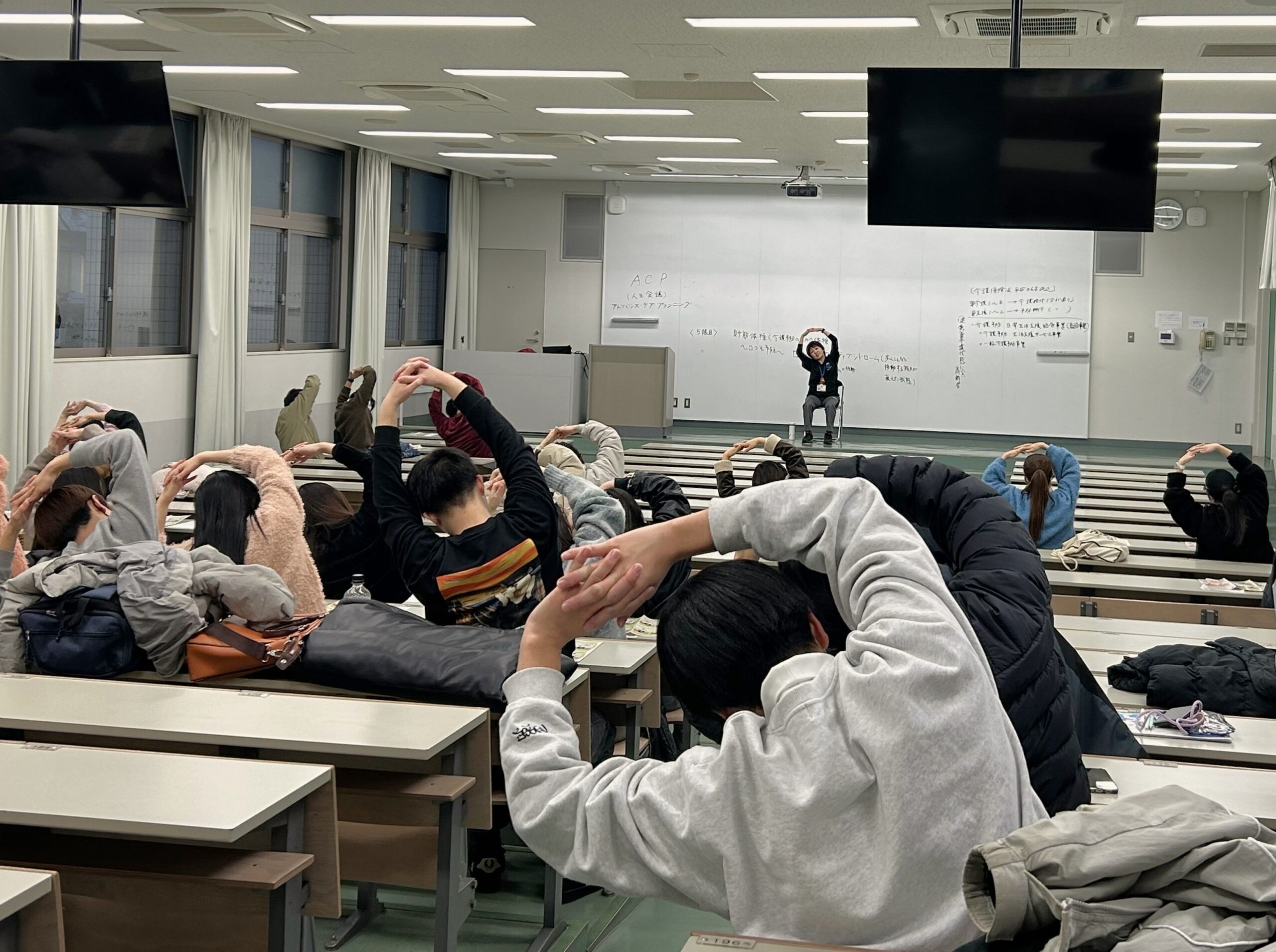 また、市役所の健康運動指導士による指導のもと、介護予防のために考案された福知山市独自の座ったままでできる貯筋体操を実際に体験しました。肩や股関節、足首などがほぐれ、学生たちは楽しそうに体操していました。