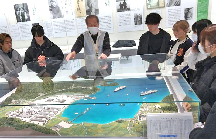 記念館では、館長からシベリア抑留の歴史的背景について講義を受けた後、「語り部」と呼ばれるボランティアの方々から、抑留生活や極寒での過酷な労働について説明を受けました。舞鶴は軍港として長い歴史を有していますが、同時に、過酷な抑留を生き延びて帰国を果たした約60万人もの引揚者が最初に祖国の地を踏んだ場所でもあります。学生たちは、引揚記念館を訪れる中で、この歴史の重みを深くかみしめていました。