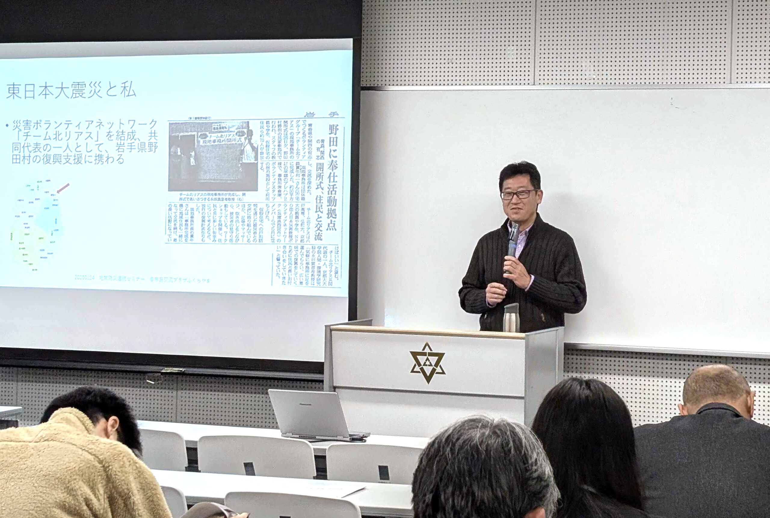 講演では、永田氏が共同代表を務めた「チーム北リアス」の活動を軸に、東日本大震災の被災地・岩手県野田村で実施された「地域見守り勉強会」「野田村復興応援フィールドツアー」「河合書道教室」の3つの復興支援の取り組みが紹介されました。支援と受援の関係は、長期化や過剰な干渉によって副作用が生じることがあり、被災地住民の主体性を尊重する支援の在り方が重要であることが強調されました。また、関わり方を変えることで新たな交流が生まれたことなど、復興支援の現場で得られた多様な知見が共有されました。