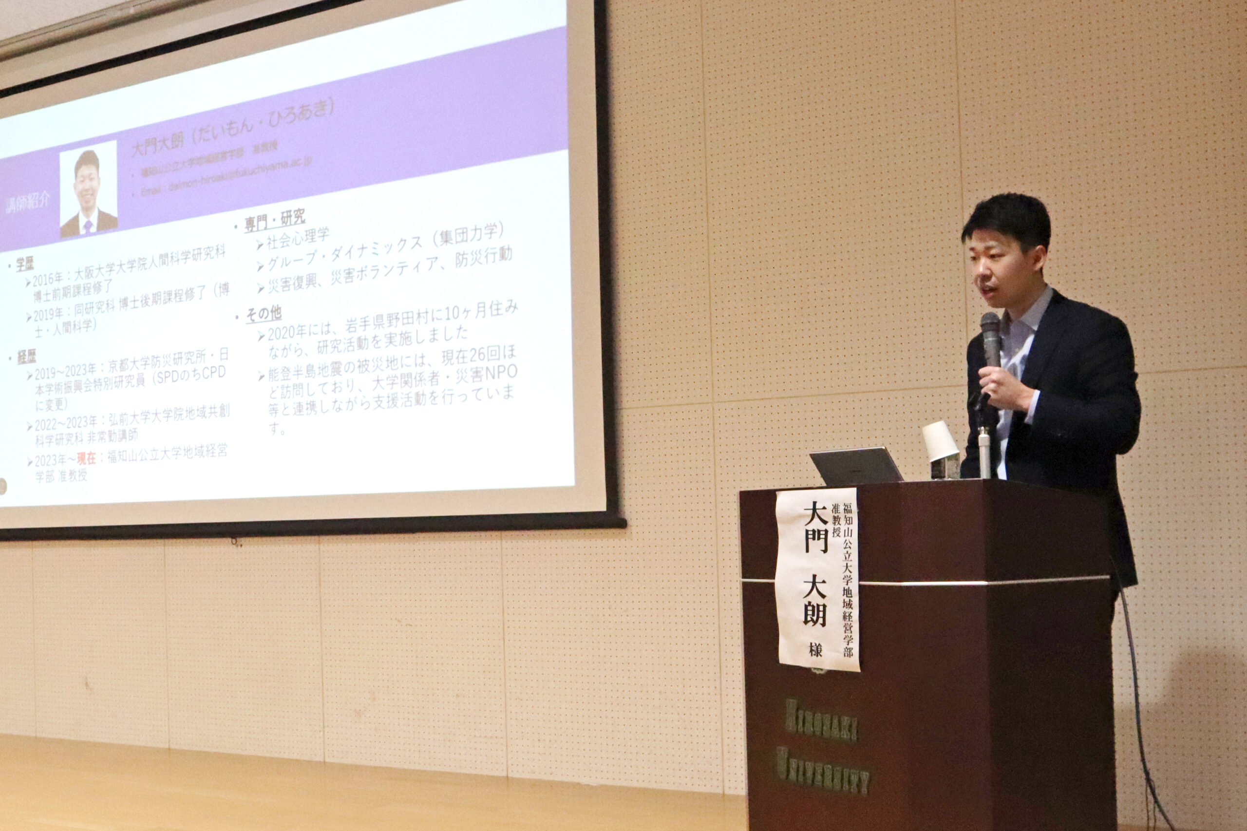 2025年1月23日(木)、弘前大学地域創生本部ボランティアセンター(青森県弘前市)主催の令和6年度活動報告会が同大学で開催され、本学地域経営学部の大門大朗准教授が講師として登壇しました。大門准教授は、「令和6年能登半島地震でのボランティア活動―『チーム・オール弘前』モデルと福知山公立大学の挑戦―」をテーマに、被災地での支援活動やその課題、今後の展望について具体的な事例を交えながら講演を行いました。