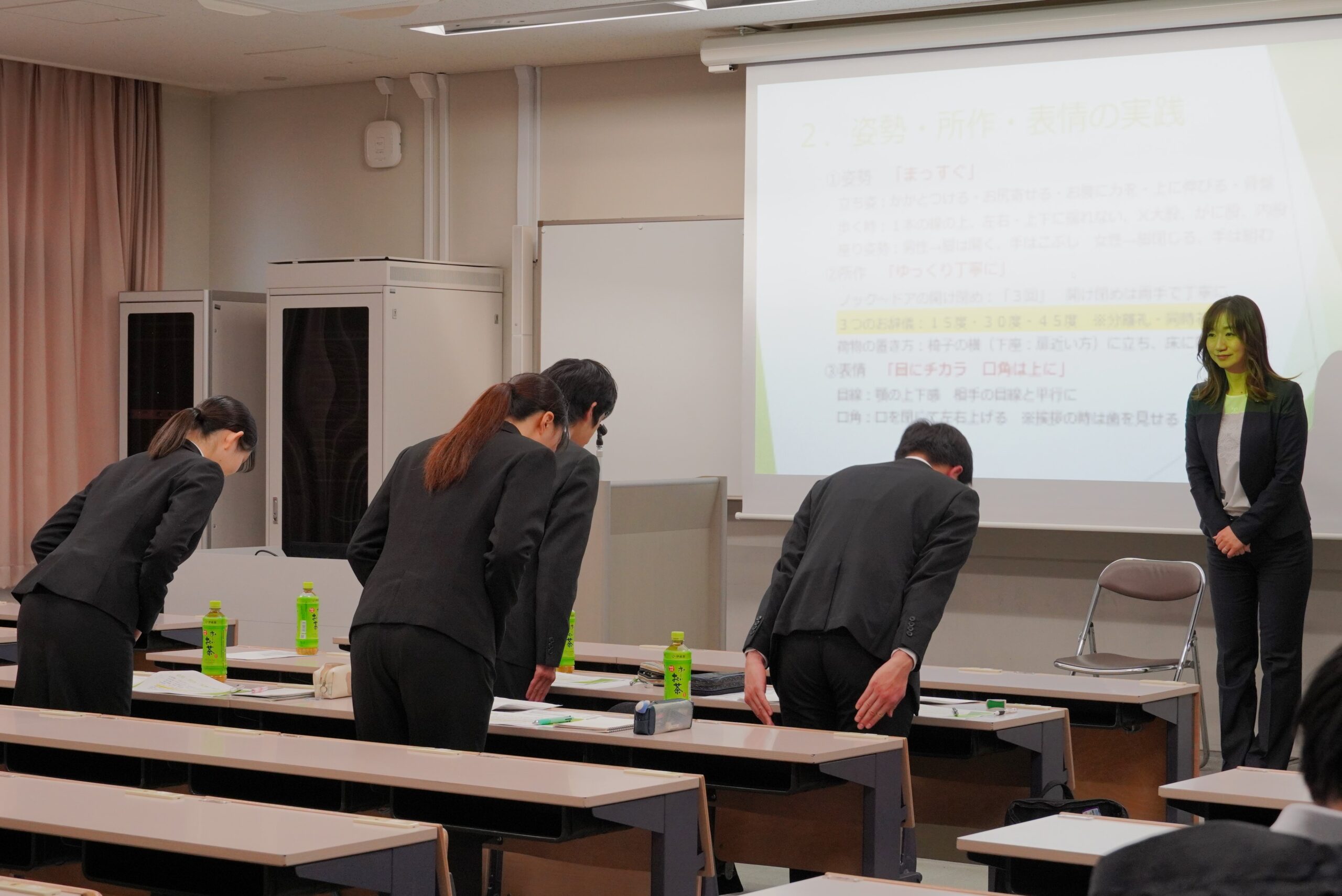 福知山西南ロータリークラブの山口剛会長による挨拶の後、学生たちは日本サービスマナー協会認定の講師による第一印象アップをテーマとしたセミナーを受講し、第一印象の重要性や、お辞儀の種類、面接での立ち居振る舞いについて学びました。その後、様々な場面を想定して、声の大きさやお辞儀のタイミング、入退室の際の注意等について実践しました。