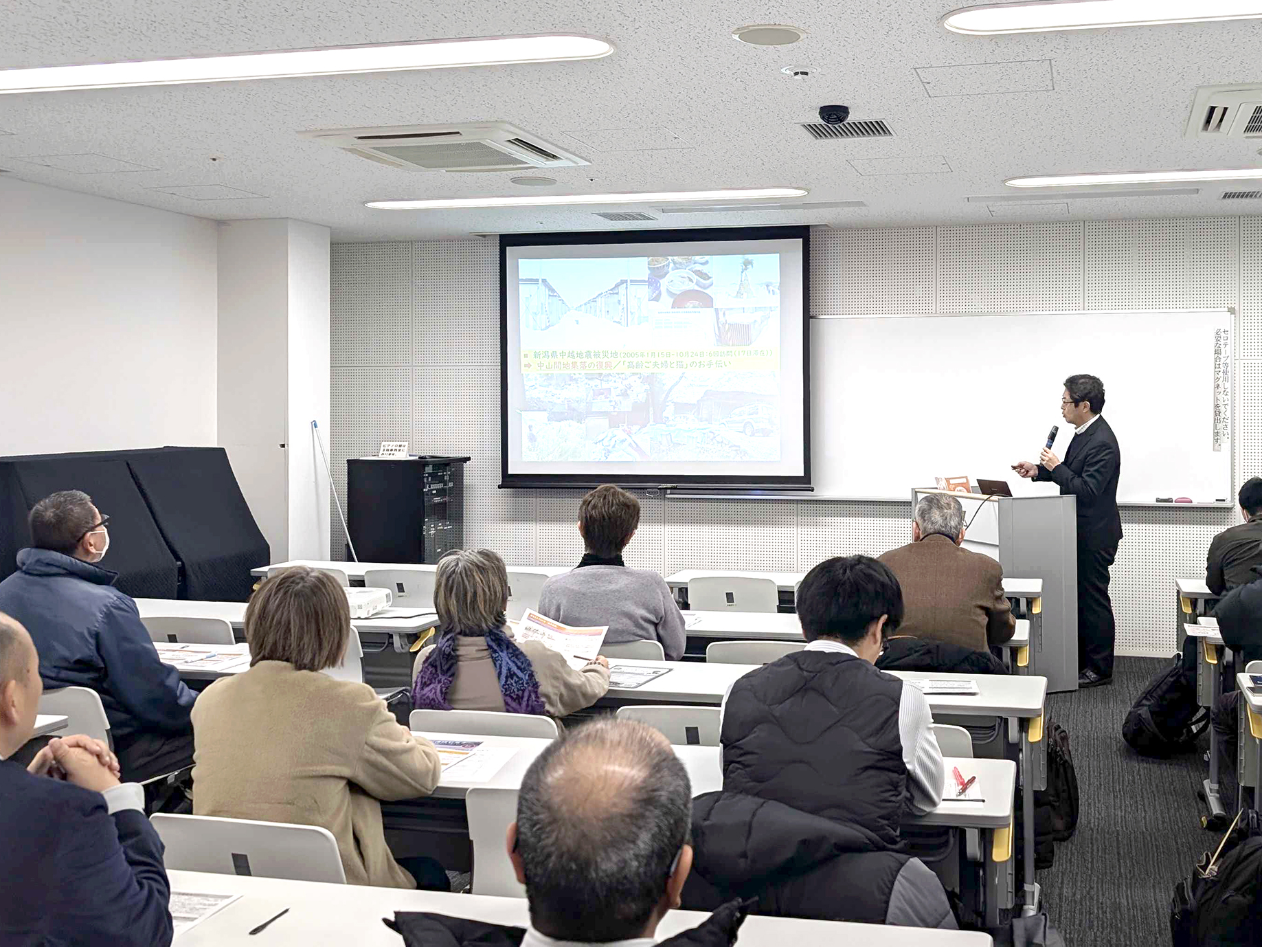 2025年2月7日(金)、本学地域防災研究センター及び地域経営学部・大門大朗研究室の主催により、第8回地域防災連続セミナー「そなえよう!みんなとペットの災害対策」を市民交流プラザふくちやま(福知山市)で開催しました。当日は、九州医療科学大学臨床心理学部の加藤謙介教授を講師に迎え、能登半島地震などの事例を踏まえた人とペットの災害対策についてご講演いただきました。