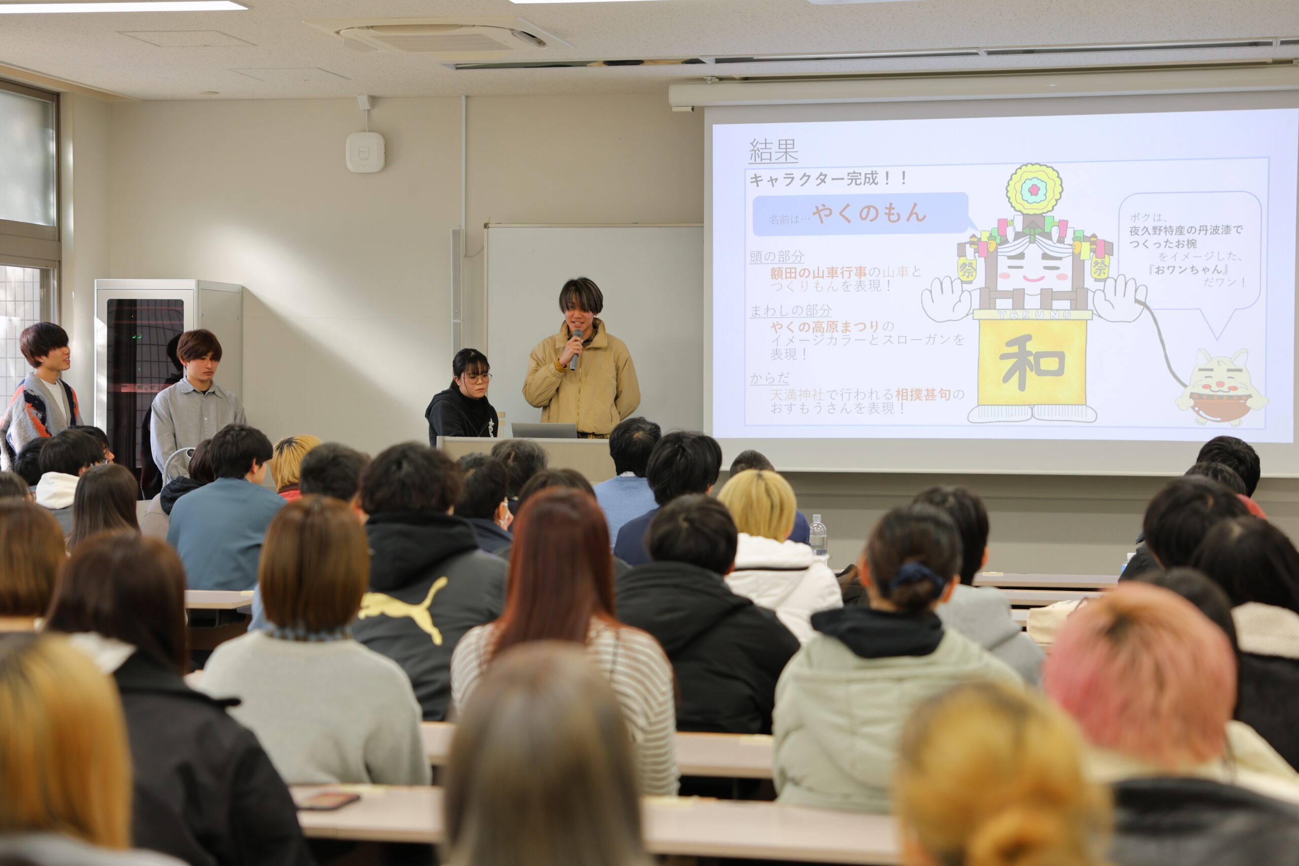 福知山市夜久野地域で主に活動した学生グループ(担当:神谷 達夫教授、中尾 誠二教授)の発表では「フィールドワークで訪れた夜久野町には沢山の魅力があり、それらを情報発信できないかと取り組んだ。地元産の食材を使った飲食店の紹介動画制作や、特産品である「むべ」に着目した入浴剤の開発、「やくの高原まつり」のキャラクター制作などを地域の方々に協力を得ながら実施した。取り組みは来年度の後輩たちにもぜひ実施してもらいたい」と語りました。