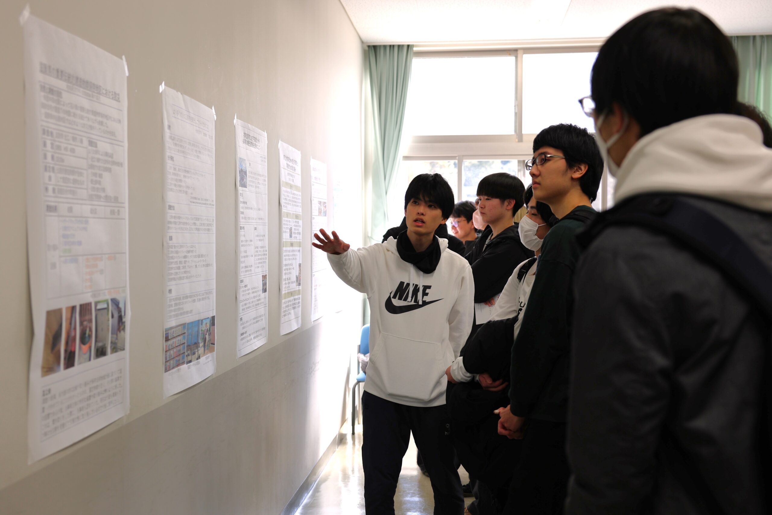 3年生でポスター展示を行う学生からは、「高校生の時から公務員の仕事に興味があり、大学でも公共経営や企業経営などについて学んできた。その中で上水道事業の運営方法について日本で民営化する動きをみせる自治体もある一方で、海外では一旦民営化したものの自治体の運営に戻したケースもあり、どう運営していくのが良いのだろうかと疑問を持ち、調査した結果をまとめた」と観覧者に説明を行い、質問に応じる姿がありました。