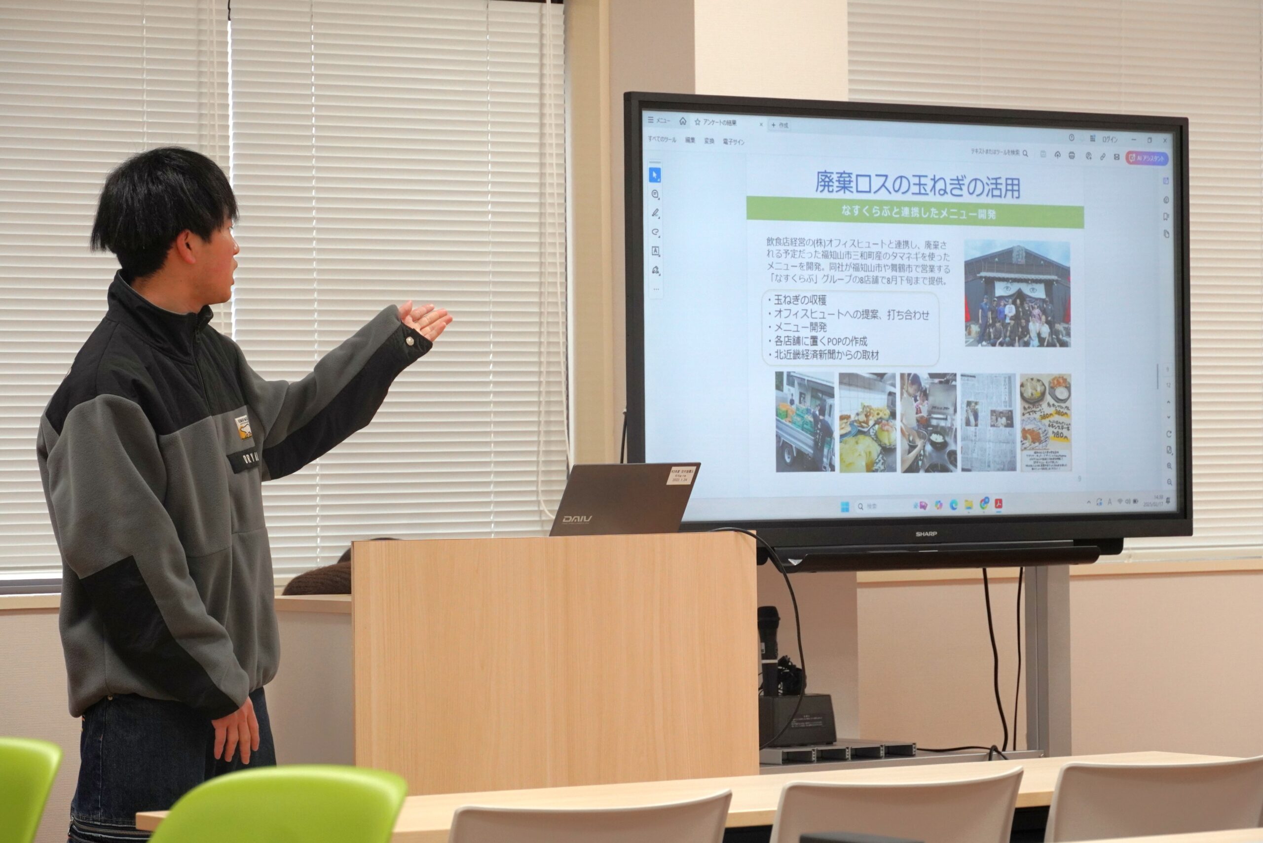 地域の食品ロス削減をめざす「アグリサーキュラーデザインin Fukuchiyama」では、昨年度までの取り組みとして、地元農家が廃棄していた規格外の万願寺とうがらしを活用した飴の制作について触れた後、今年度の実績として、廃棄される予定だった玉ねぎを福知山市や舞鶴市に複数店舗を構える飲食店と連携し、メニューの考案やPOP作成の取り組みを紹介しました。「販路の開拓が今年度の課題で、今回ご縁のあった飲食店の方々との繋がりを大切にしながら、次年度は企画・商品開発に力を入れたい」という言葉で報告が締めくくられました。