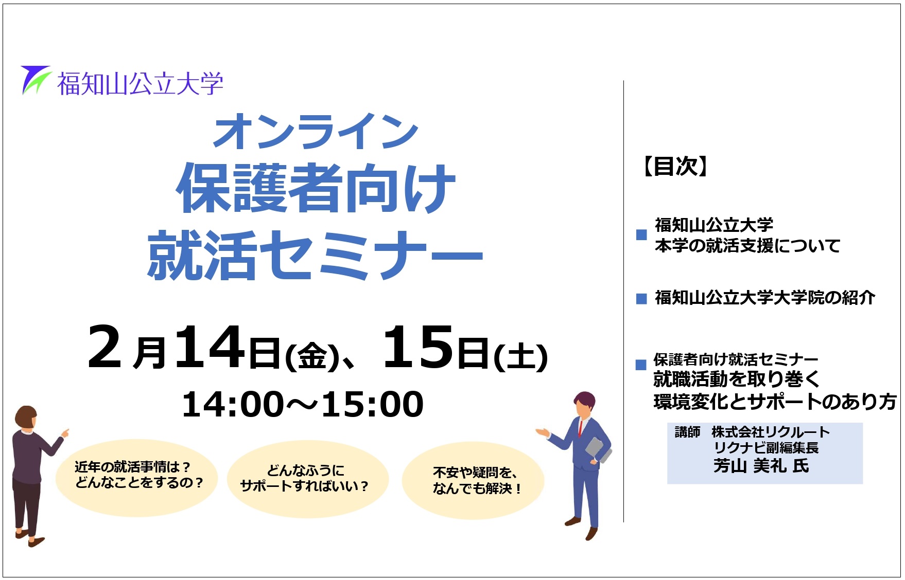 2025年2月14日(金)・15日(土)、「保護者向け就活セミナー」をオンライン(Zoom)で実施しました。セミナーには両日併せて約55人が参加し、本学の就職活動支援内容や、就職活動を取り巻く環境変化とサポートのあり方について説明を行いました。