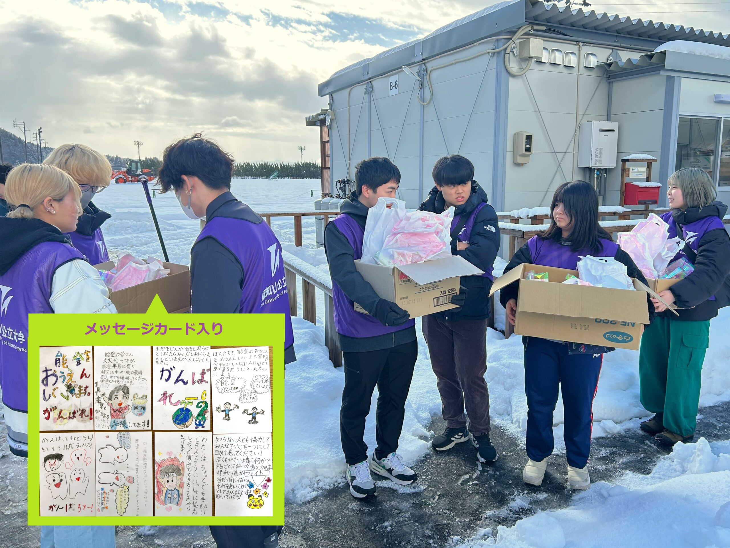 毎月、定期的に被災地を訪問している七福ふっこう隊(STL助成金採択プロジェクト団体)による戸別訪問では、福知山市内の幼稚園児、小中高校生が書いてくれた能登の方へ向けた応援メッセージと共に、バレンタインのチョコレートや、毛糸の手編みで作られた「福くつした」が贈られました。