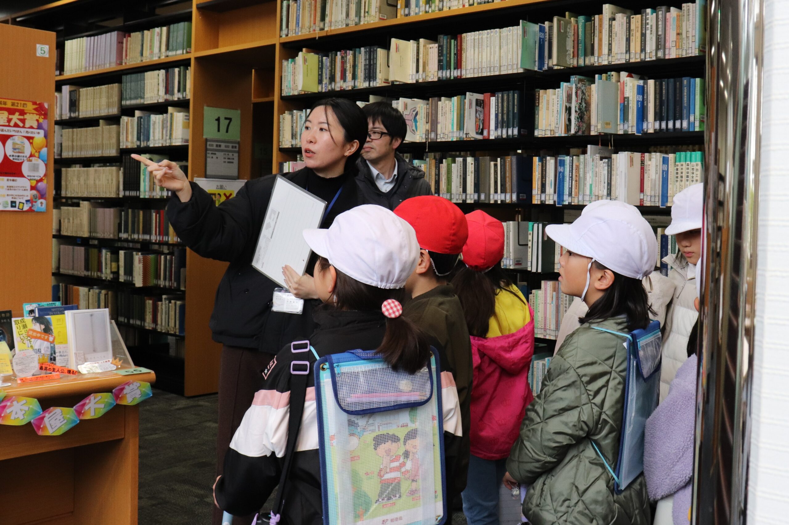 続いて、講義室やメディアセンターなどの施設を見学し、大学の雰囲気を体験していただきました。講義室では、200人以上が入る広い教室に驚く児童の姿が見られました。また、メディアセンターでは、多くの本が並ぶ空間に興味を持ち、「どれくらいの本がありますか?」といった質問をする児童もいました。