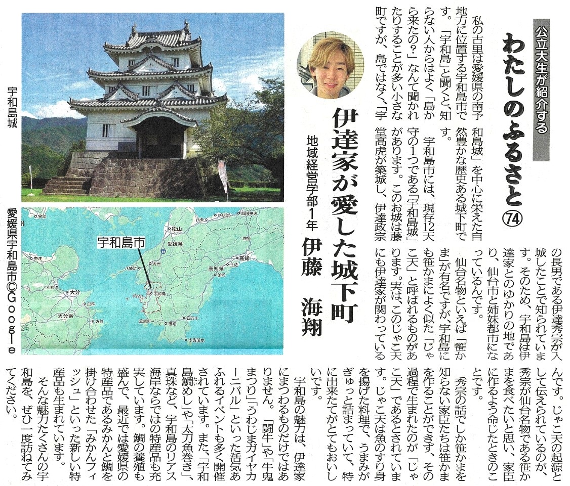 両丹日日新聞(2025年2月21日付け)に、「公立大生が紹介する“わたしのふるさと Vol.74”」として、伊藤海翔さん(地域経営学部1年生)の記事が掲載されました。愛媛県宇和島市出身の伊藤さんの記事には、宇和島城に歴史上ゆかりのある伊達家に関する話題や、活気あるイベント、特産品などが紹介されています。