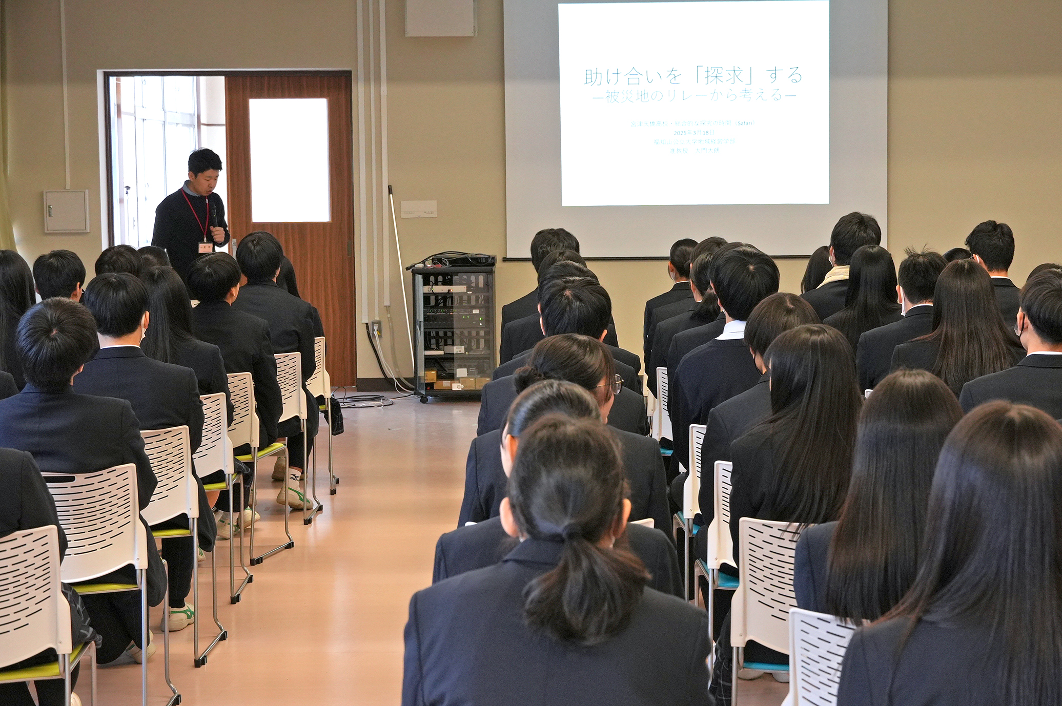 講演では、「助け合いを『探求』する-被災地のリレーから考える-」をテーマに、大門准教授がこれまで研究・実践してきた被災地支援の経験をもとに、災害時における助け合いの重要性や地域コミュニティの役割について話しました。参加した生徒たちは、被災地支援における「恩送り」という考え方を学び、過去の被災地における助け合いの実例を通じて、防災・減災に対する意識をより高めることができた様子でした。