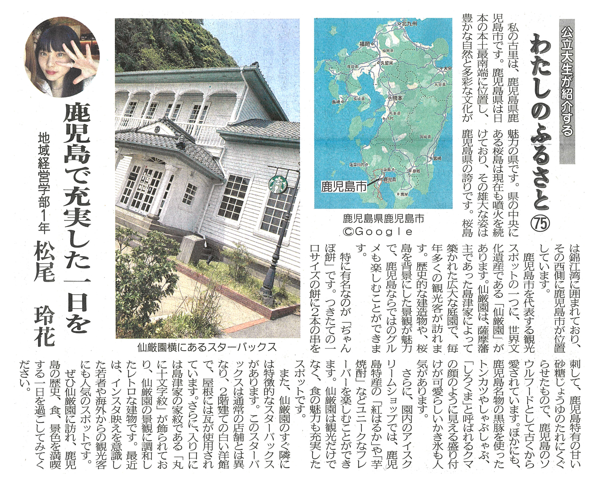 両丹日日新聞(2025年3月24日付け)に、「公立大生が紹介する“わたしのふるさと Vol.75”」として、松尾玲花さん(地域経営学部1年生)の記事が掲載されました。鹿児島県鹿児島市出身の松尾さんの記事には、世界文化遺産である「仙厳園」やその土地ならではの特徴を持つスターバックスの店舗などが紹介されています。