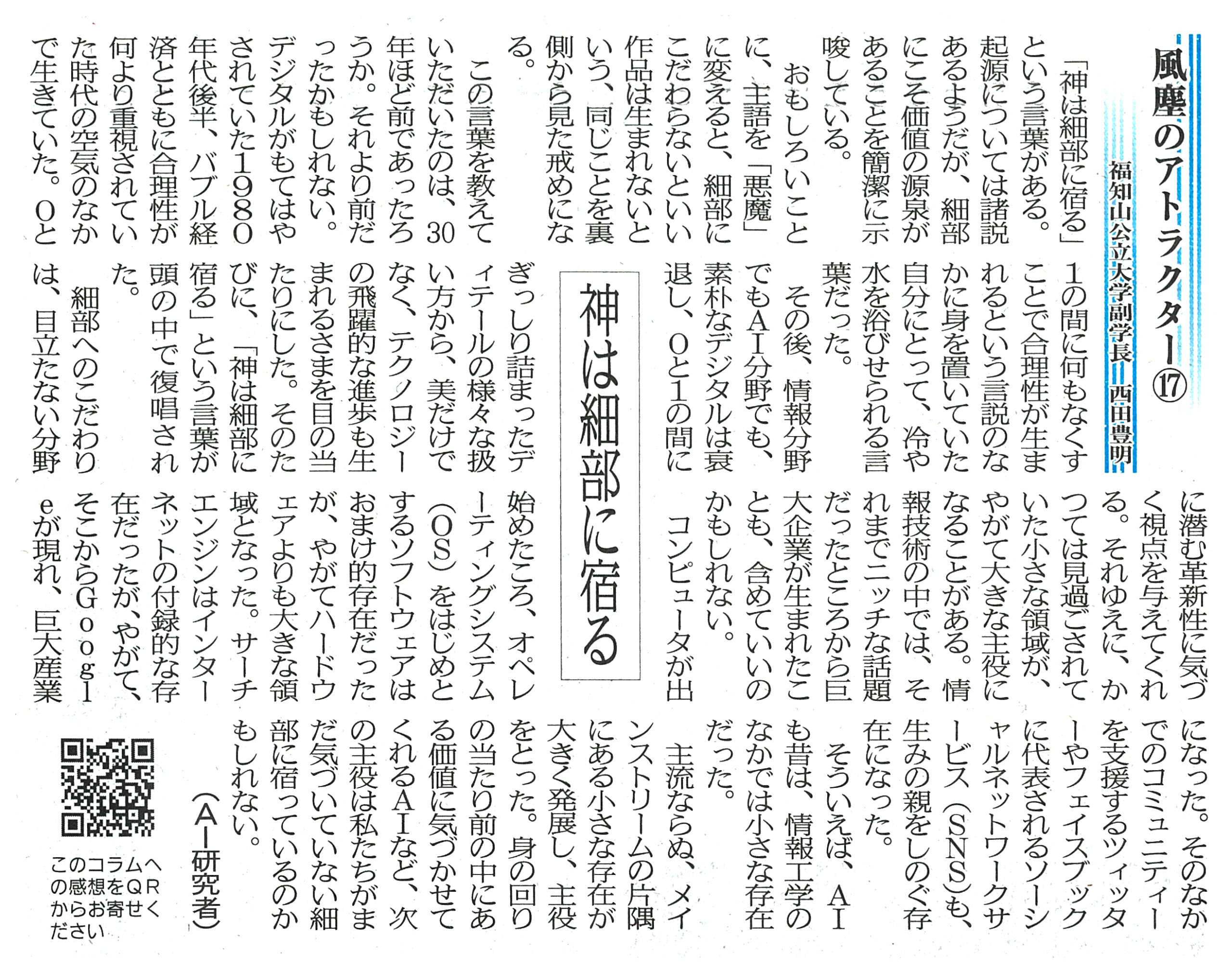 両丹日日新聞に西田副学長のコラムが掲載されました レポート 2025.03.28 両丹日日新聞(2025年3月25日付)に西田副学長が寄稿したコラム「風塵のアトラクター⑰神は細部に宿る」が掲載されました。 (両丹日日新聞社提供・無断複製及び転載を禁じます) 前回の記事はこちら ツイート