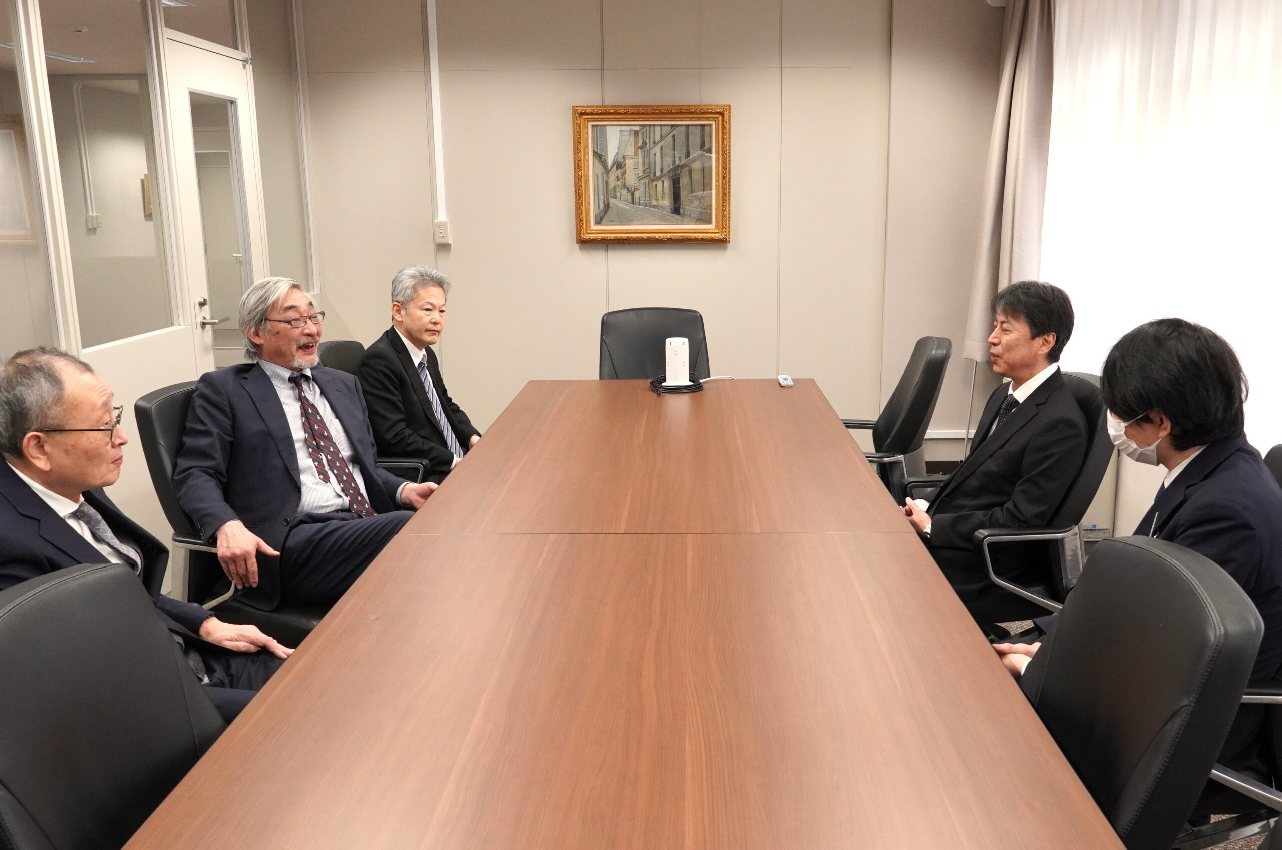 はじめにネーミングライツ看板前にて記念撮影を行い、その後、川添学長、倉田副学長、辻局長と懇談を行いました。