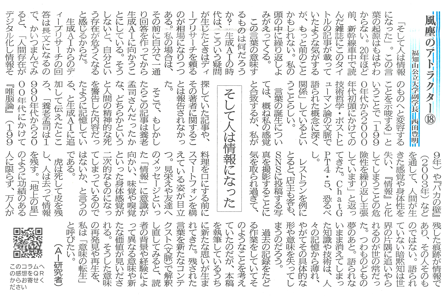 両丹日日新聞に西田副学長のコラムが掲載されました レポート 2025.04.01 両丹日日新聞(2025年4月1日付)に西田副学長が寄稿したコラム「風塵のアトラクター⑱そして人は情報になった」が掲載されました。 (両丹日日新聞社提供・無断複製及び転載を禁じます) 前回の記事はこちら ツイート