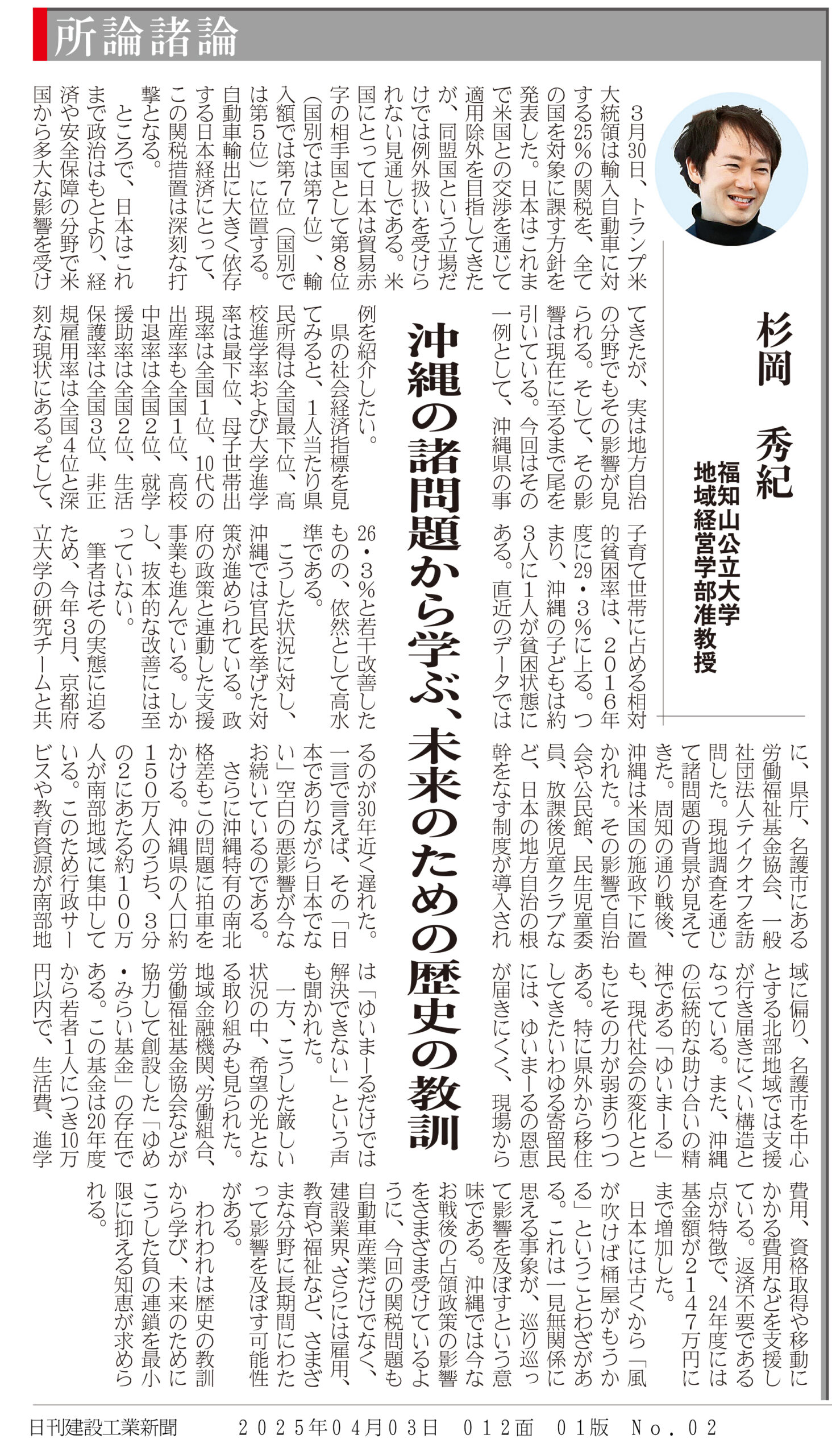 日刊建設工業新聞「所論諸論」に杉岡准教授が寄稿しました レポート 2025.04.04 日刊建設工業新聞「所論諸論」(2025年4月3日付け)に、地域経営学部・杉岡秀紀准教授が寄稿しました。 (日刊建設工業新聞社提供) 前回の記事はこちら ツイート