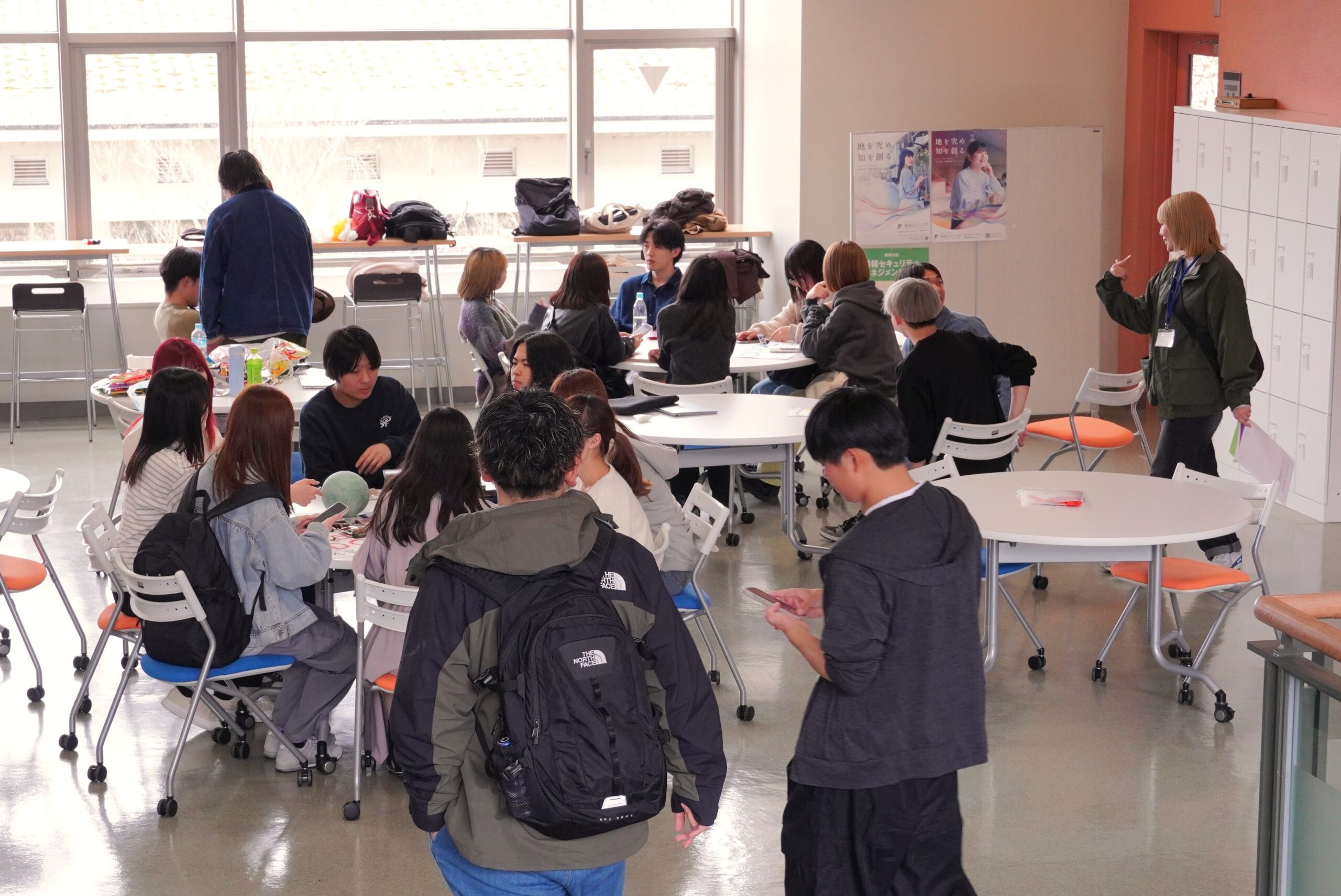 1年生はまず本学食堂「PILLAR Dining」でサークルや学生団体ら(全38団体)の紹介を聞き、各活動紹介が行われる教室へと移動しました。