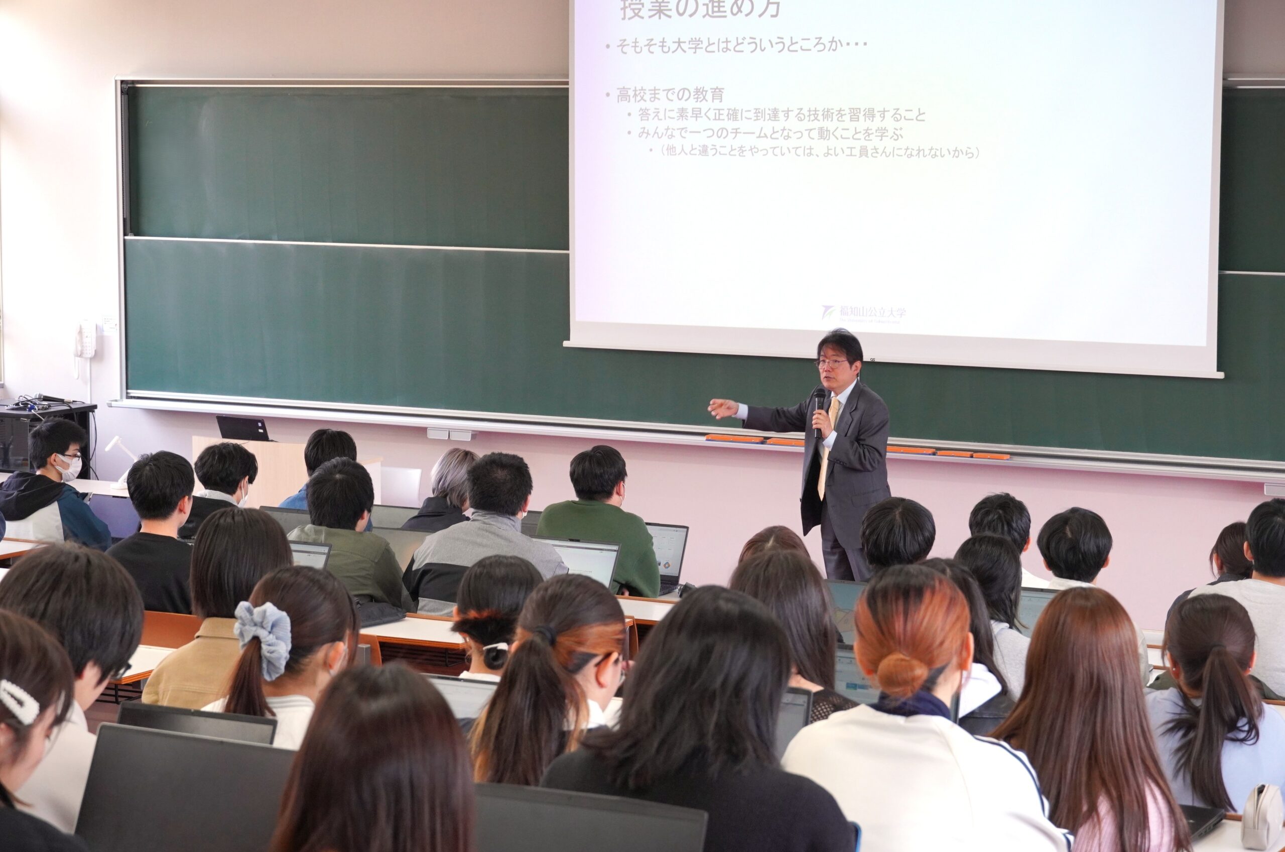 情報学部「サービスエンジニアリング」(担当:情報学部 山本 吉伸教授)では、1年生が多く受講していることもあり、講義冒頭のオリエンテーションで授業の進め方や大学と高校の違いの説明や、サービスエンジニアリングとはどのような学問かについて紹介がありました。