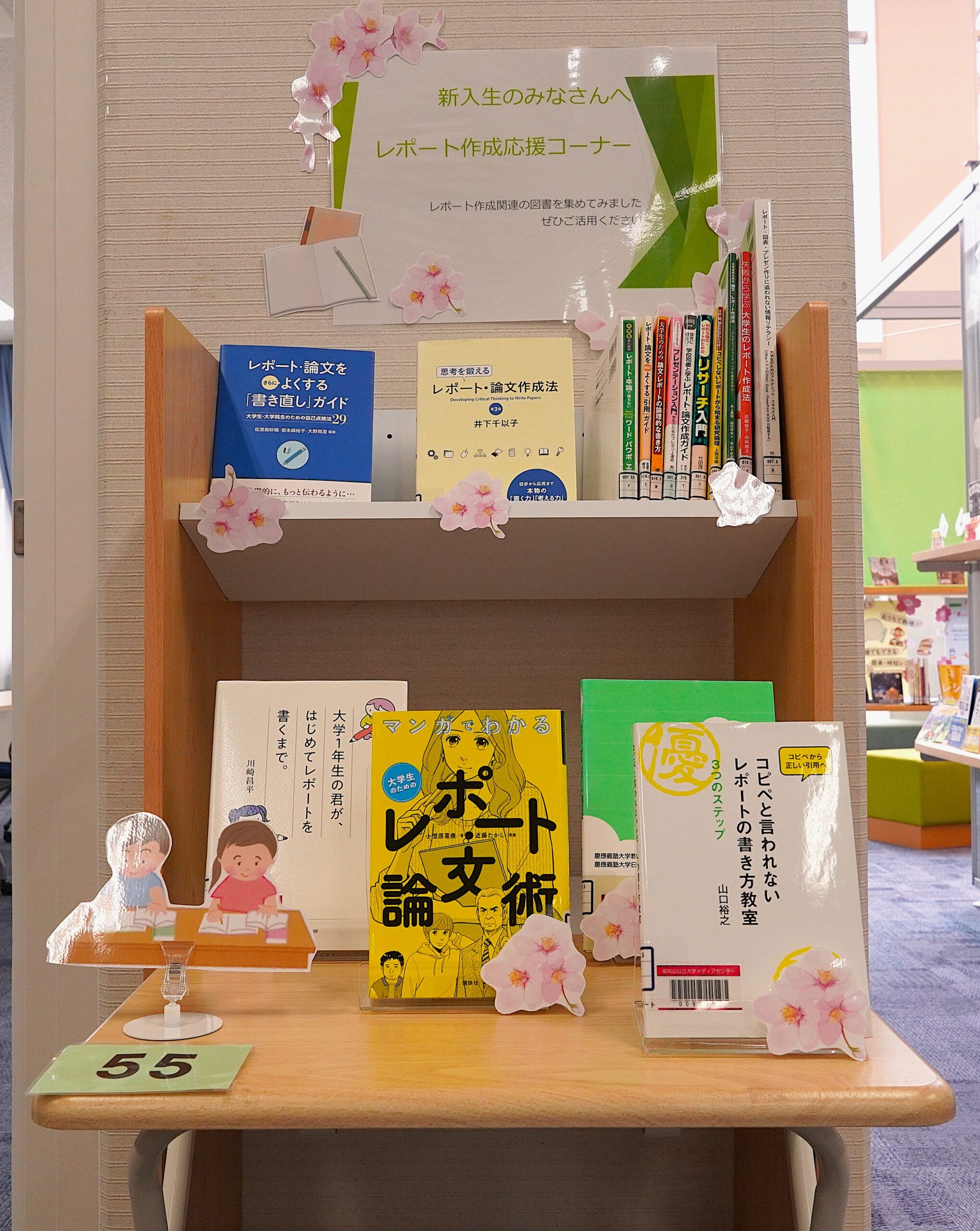 本学メディアセンターでは新入生の新生活応援コーナーとして、企画展示「レポート作成応援コーナー」を実施しています。
