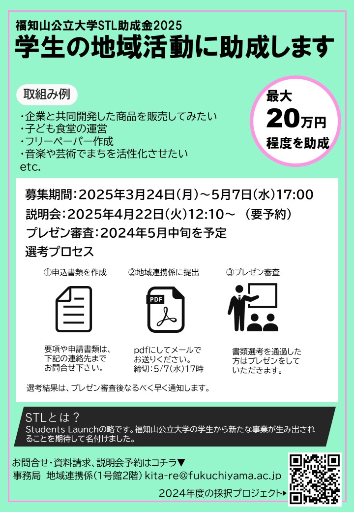 応募にあたっては「福知山公立大学 STL 助成金 2025応募要項」をご確認ください。