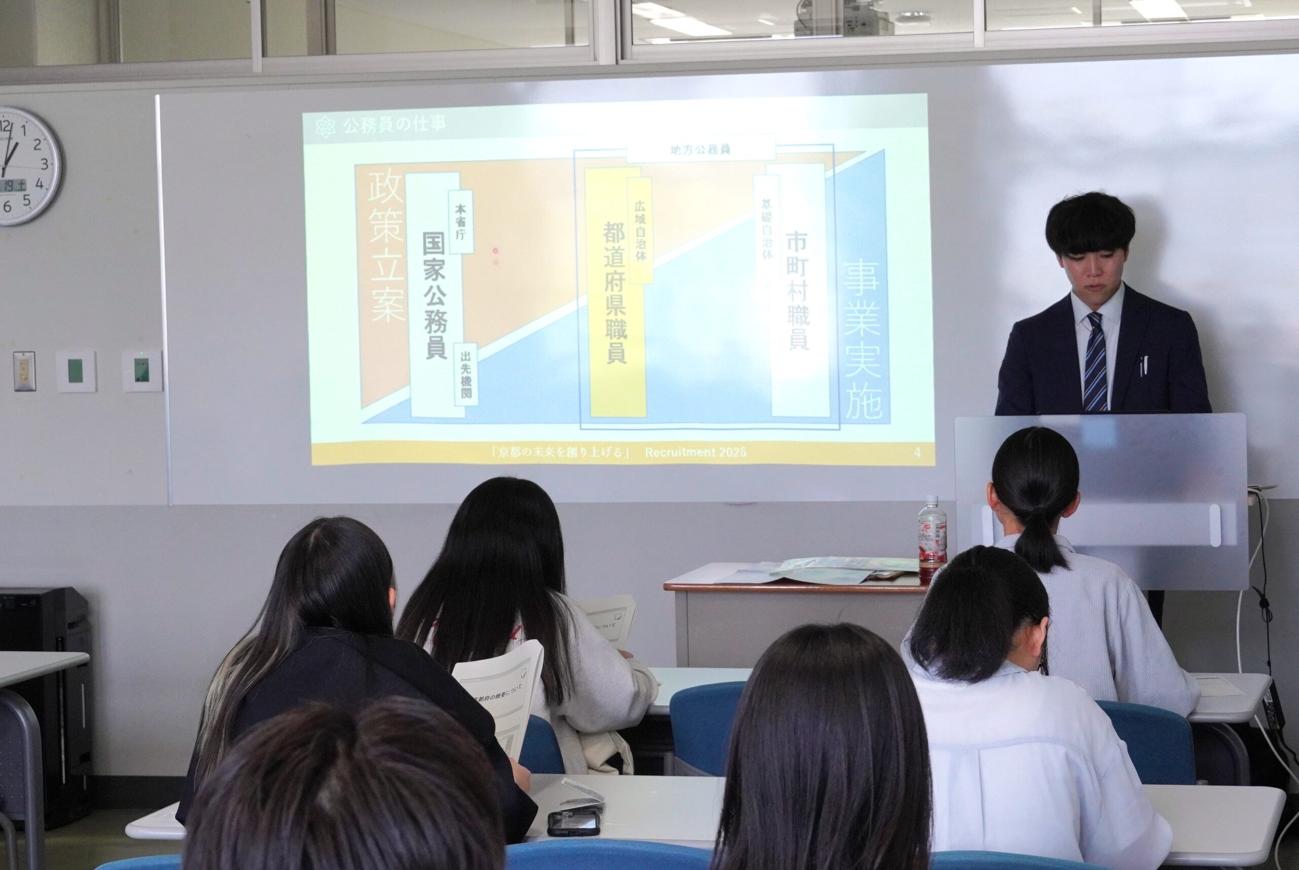1・2・3年生を対象とした公務員講座ガイダンス、4年生を対象とした試験直前ガイダンス、全学年対象の「北京都公務員合同説明会」(主催:本学学務課キャリア支援係、自衛隊京都地方協力本部、協力:北京都ジョブパーク)の3つのキャリアイベントに多くの学生が参加しました。