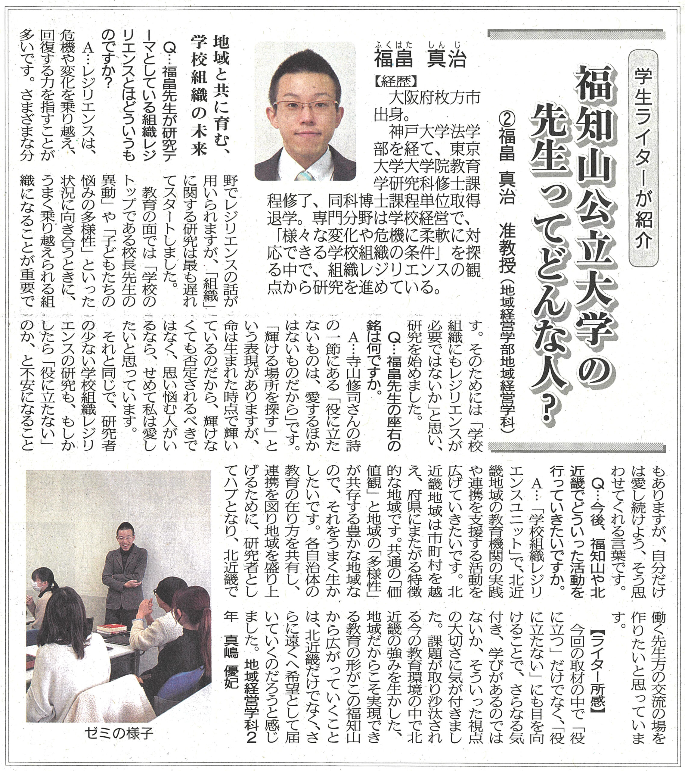 両丹日日新聞(2025年4月21日付)にて、連載企画「学生ライターが紹介 福知山公立大学の先生ってどんな人?」の第2回として、地域経営学部の福畠真治准教授を紹介する記事が掲載されました。