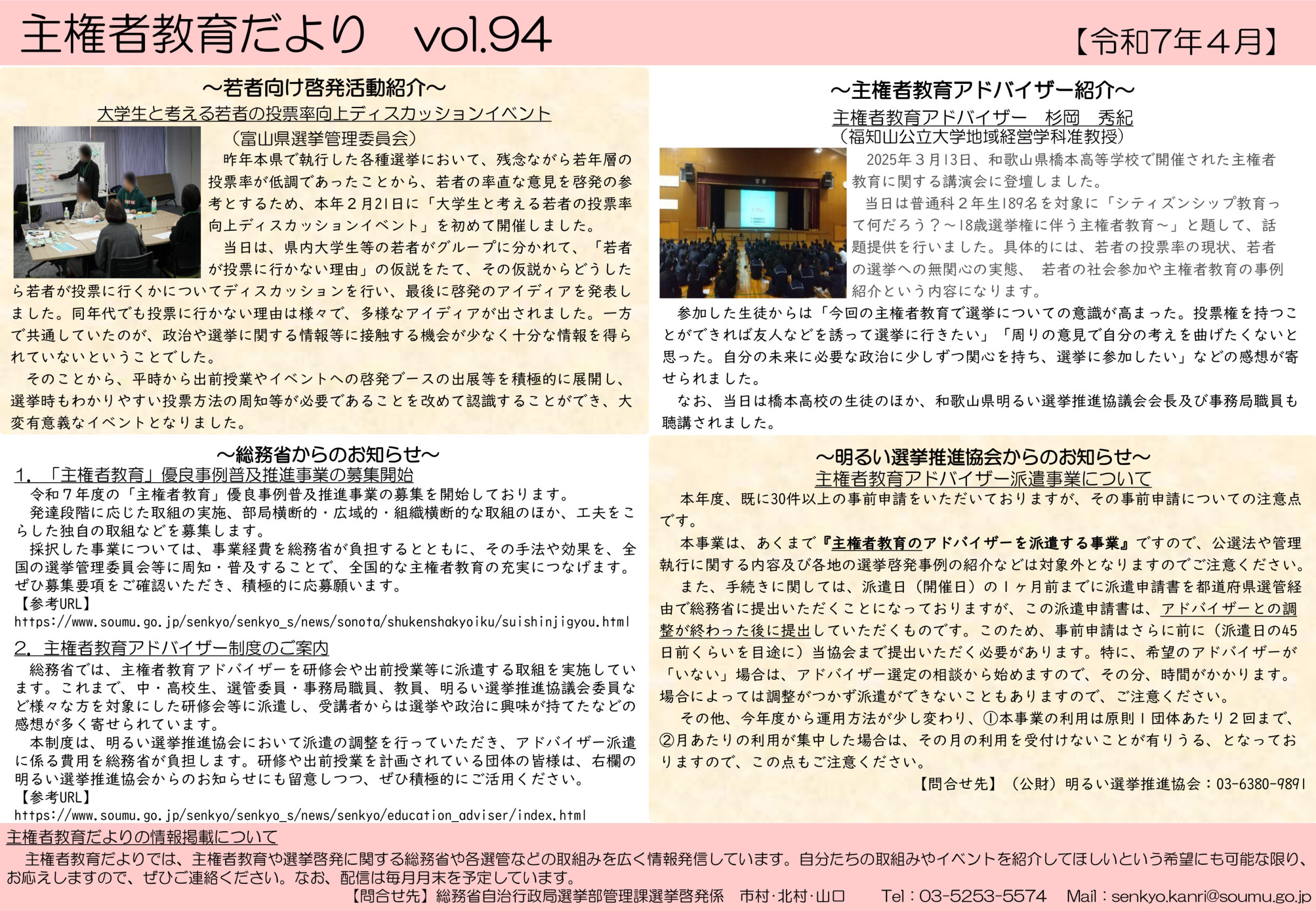 総務省「主権者教育だよりvol.94」に杉岡准教授が寄稿しました レポート 2025.05.02 総務省「主権者教育だよりvol.94」(令和7年4月発行)に、総務省の主権者教育アドバイザーを務める本学地域経営学部の杉岡秀紀准教授が寄稿しました。 ツイート