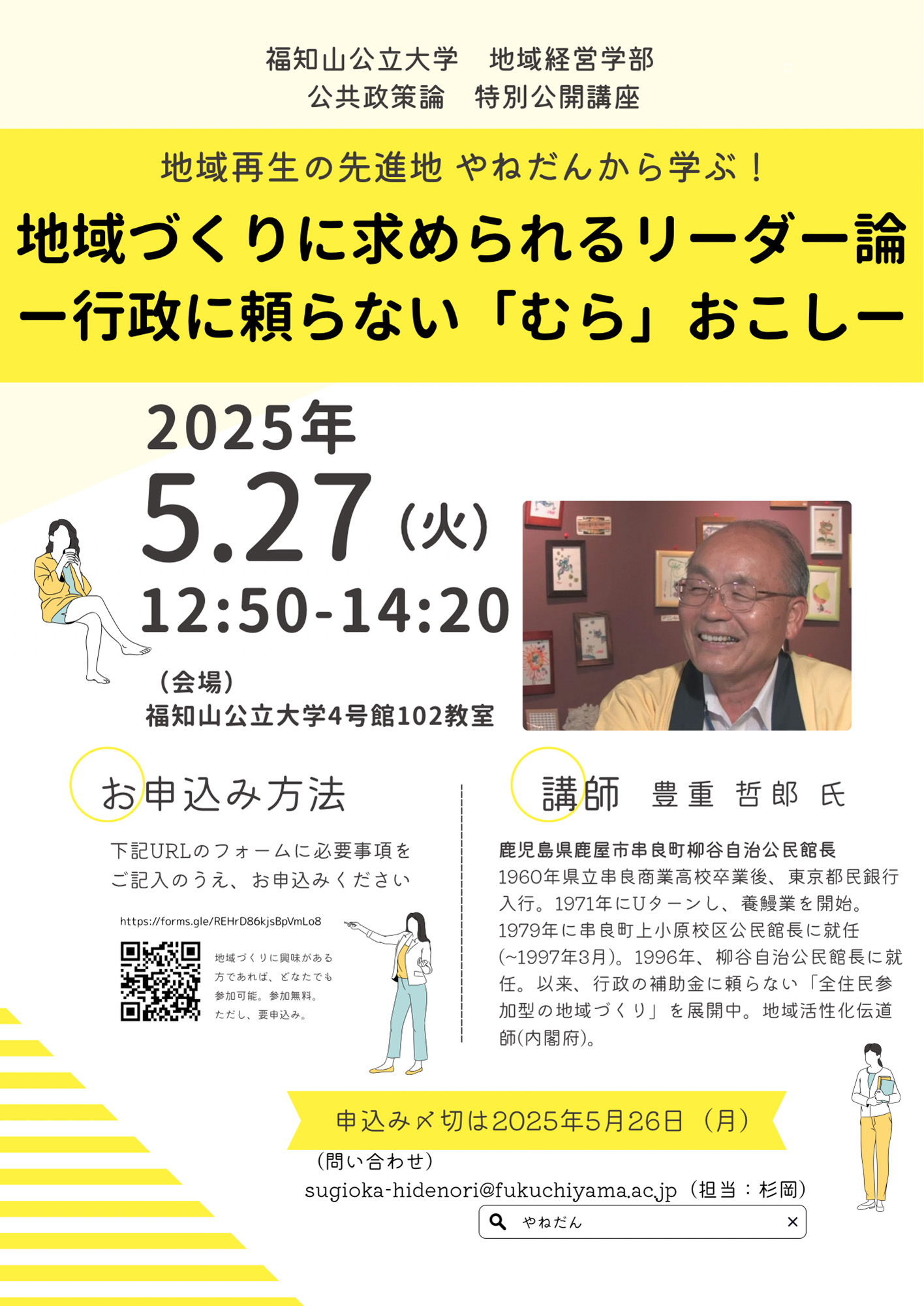 2025年5月27日(火)、地域経営学部の講義「公共政策論」(担当:杉岡秀紀准教授)の一環で、柳谷自治公民館(鹿児島県)の豊重哲郎館長をゲストスピーカーとして招聘し、特別公開講座「地域づくりに求められるリーダー論-行政に頼らない「むら」おこし―」を本学で開催します。関心のある方はどなたでも受講可能ですので、下記URLのフォームに必要事項をご記入のうえ、ぜひお申込みください。