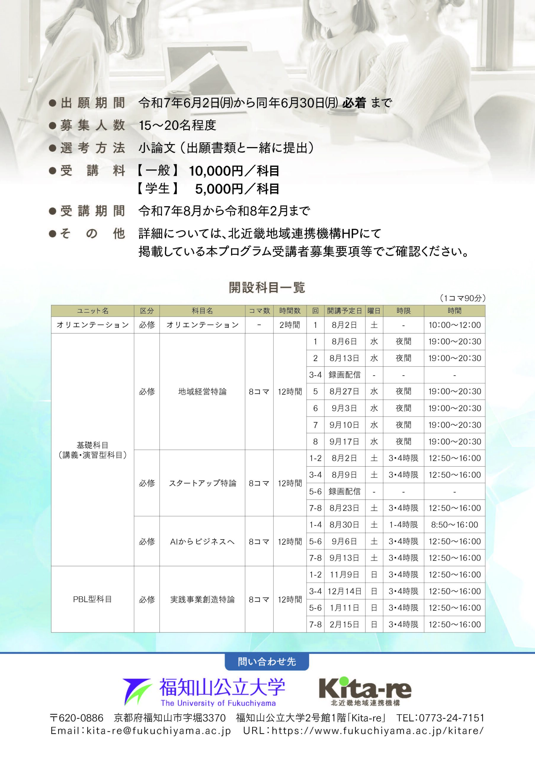 本学では福知山市からの委託を受け、起業をめざす方や企業を支援する方が必要な知識及びスキルを短期間で修得するための「NEXT産業創造プログラム」を実施します。