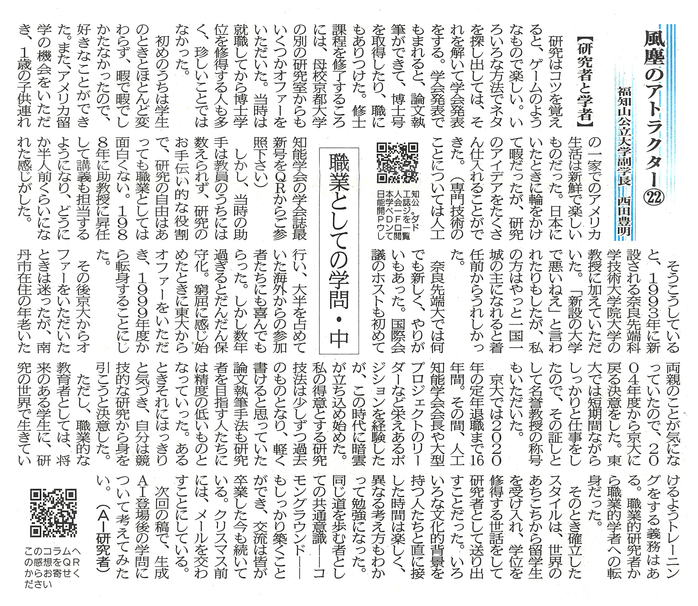 両丹日日新聞に西田副学長のコラムが掲載されました レポート 2025.05.21 両丹日日新聞(2025年5月20日付)に西田副学長が寄稿したコラム「風塵のアトラクター㉒職業としての学問・中」が掲載されました。 (両丹日日新聞社提供・無断複製及び転載を禁じます) 前回の記事はこちら ツイート