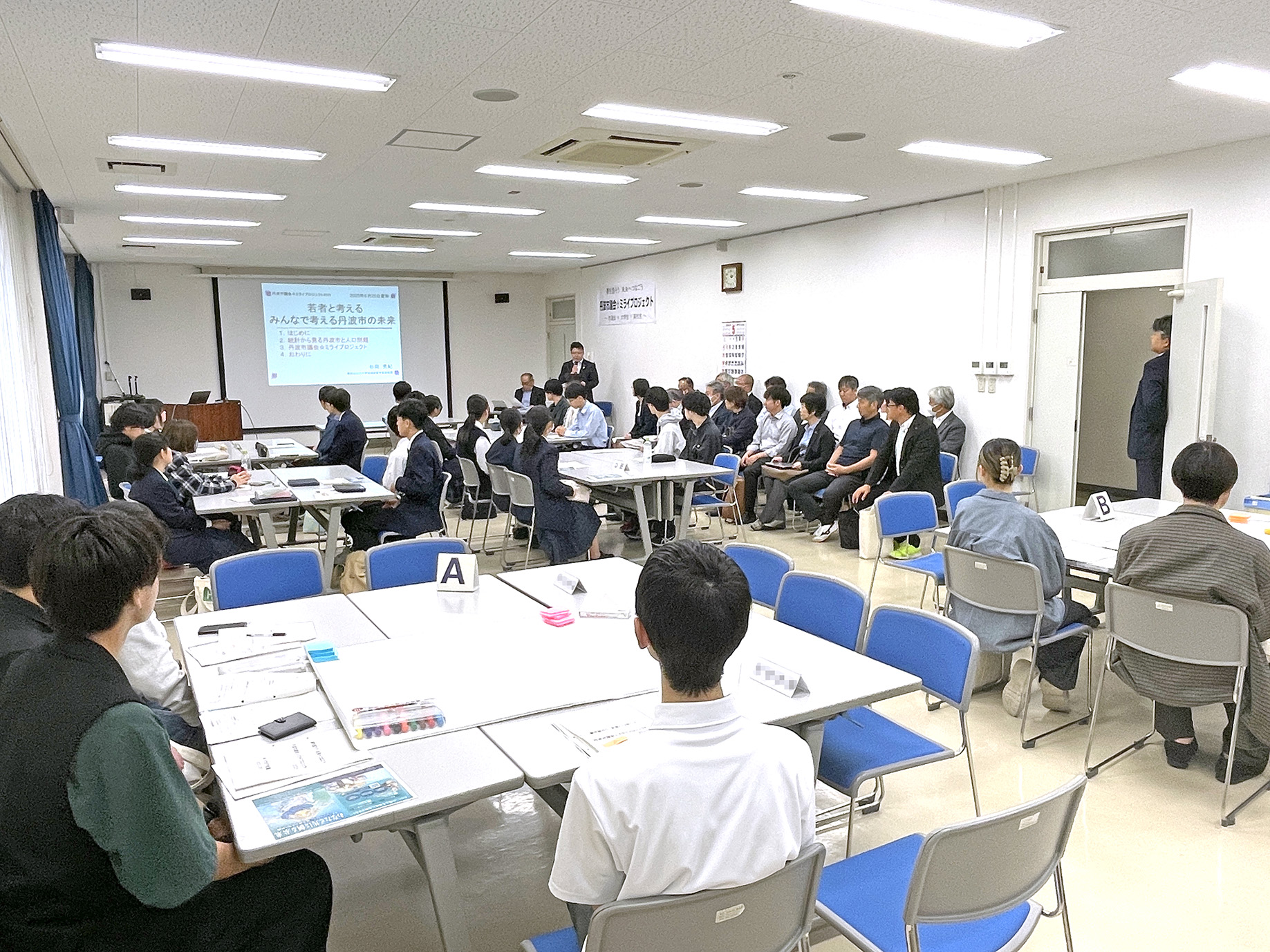 当日は、谷水雄一議長による開会挨拶、西本嘉宏議会運営委員長による本プロジェクトの説明の後、「若者と考える、みんなで考える丹波市の未来」をテーマに、丹波市議会議員20名、大学生13名、高校生17名(2名欠席)による計50名が5グループに分かれ、グループワーク(ワールドカフェ形式)を実施しました。杉岡ゼミの学生は、ファシリテーターとして高校生や市議会議員の意見や思いを引き出す役割を担いました。最後に、杉岡准教授による講評、須原弥生副議長の挨拶が行われ、閉会となりました。
