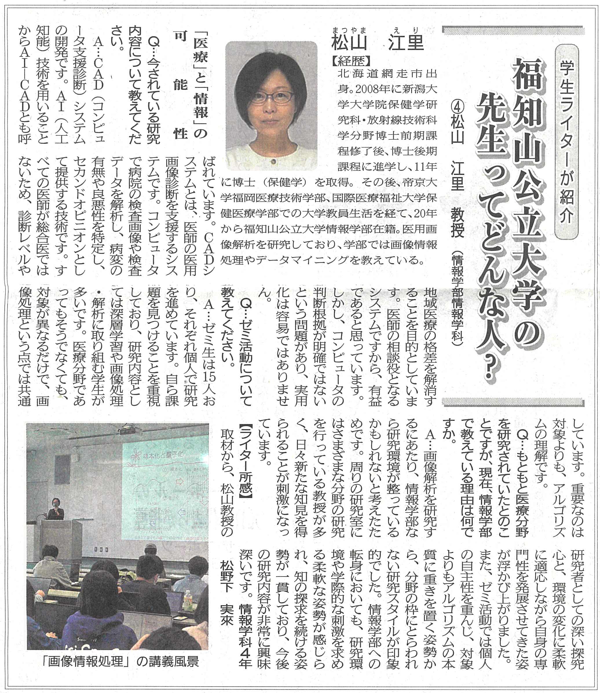 両丹日日新聞(2025年5月26日付)にて、連載企画「学生ライターが紹介 福知山公立大学の先生ってどんな人?」の第4回として、情報学部の松山江里教授を紹介する記事が掲載されました。