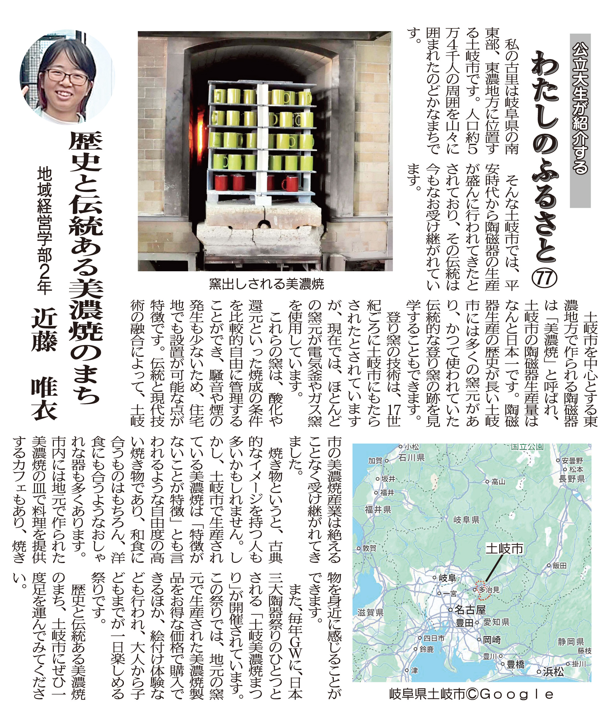 両丹日日新聞に近藤唯衣さん(2年生)の記事が掲載されました レポート 2025.05.29 両丹日日新聞(2025年5月27日付け)に、「公立大生が紹介する“わたしのふるさと Vol.77”」として、近藤唯衣さん(地域経営学部2年生)の記事が掲載されました。近藤さんは、出身地である岐阜県土岐市が生産量日本一を誇る「美濃焼」について紹介しています。 (両丹日日新聞社提供・無断複製及び転載を禁じます) 前回の記事はこちら ツイート