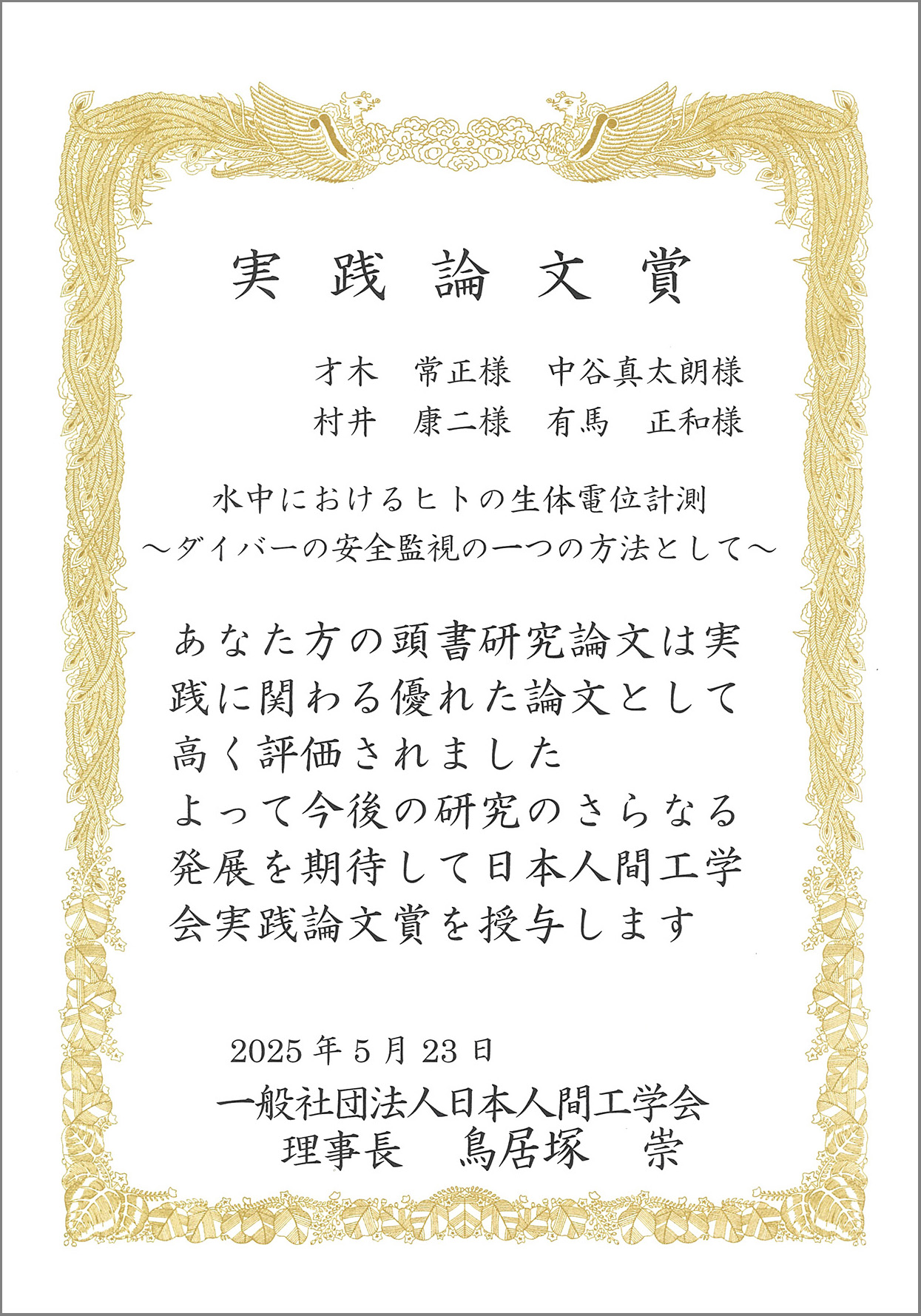 情報学部の才木常正教授が日本人間工学会より実践論文賞を受賞しました。
