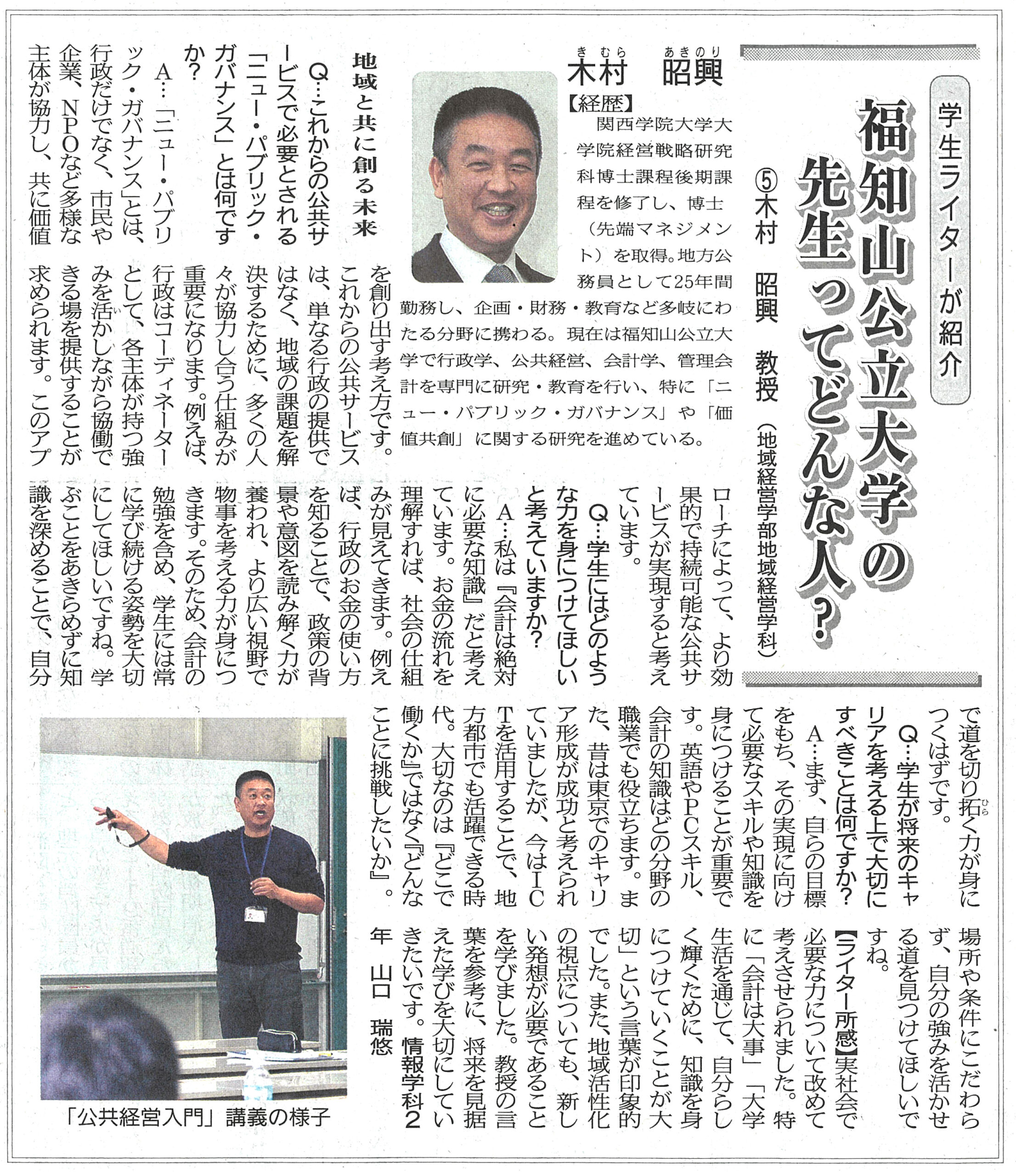 両丹日日新聞(2025年6月9日付)にて、連載企画「学生ライターが紹介 福知山公立大学の先生ってどんな人?」の第5回として、地域経営学部の木村昭興教授を紹介する記事が掲載されました。