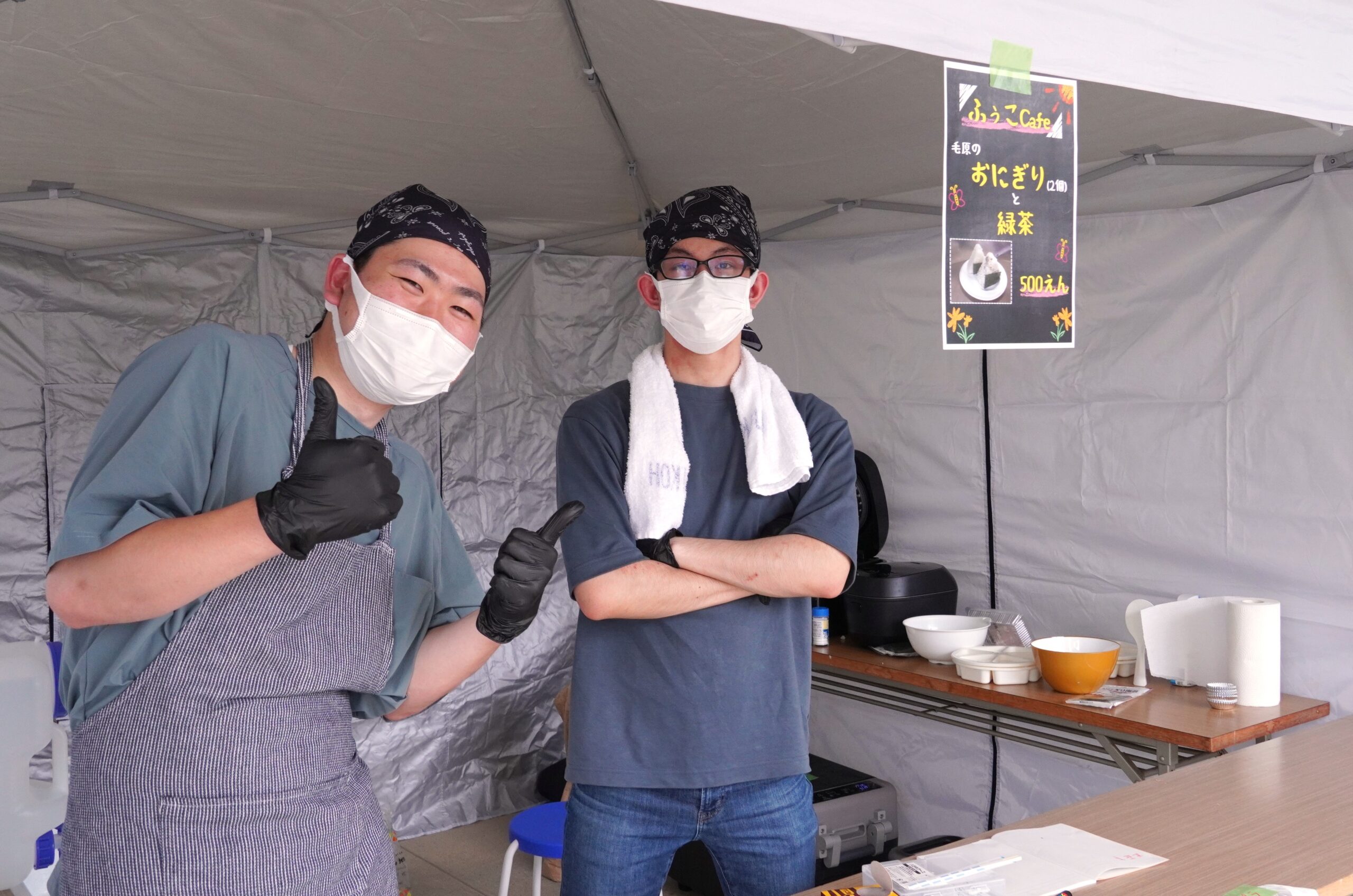 山本ゼミは展示にて、研究開発を進めている「地域でフリーマーケットのように活用できる無人売買システム」の紹介を行い、マーケットではカフェ運営を行う公認サークル「サービスビジネス研究会」が「ふぅこカフェ」として出店を行い、研究室で育て収穫したお米をおにぎりにして販売を行いました。また、運営本部にも協力しており、山本先生含め、交代しながら交通誘導なども行っていました。
