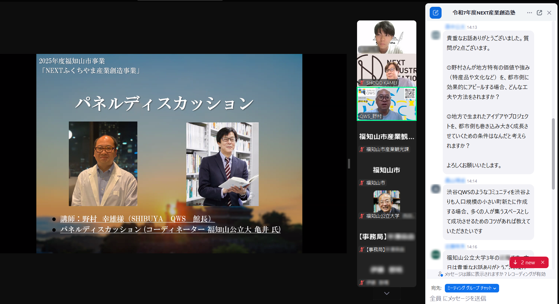 講演後に実施されたパネルディスカッションは、本学の亀井省吾教授(北近畿地域連携機構NEXTユニット長)がコーディネーターを務め、「都市と地方の共創から新産業は創出できるか?」をテーマに活発な議論が交わされました。社会人や学生から登壇者への質問が多数寄せられ、時間内にすべてに回答できないほど参加者の関心が高く、まさに“参加型”のセッションとなりました。