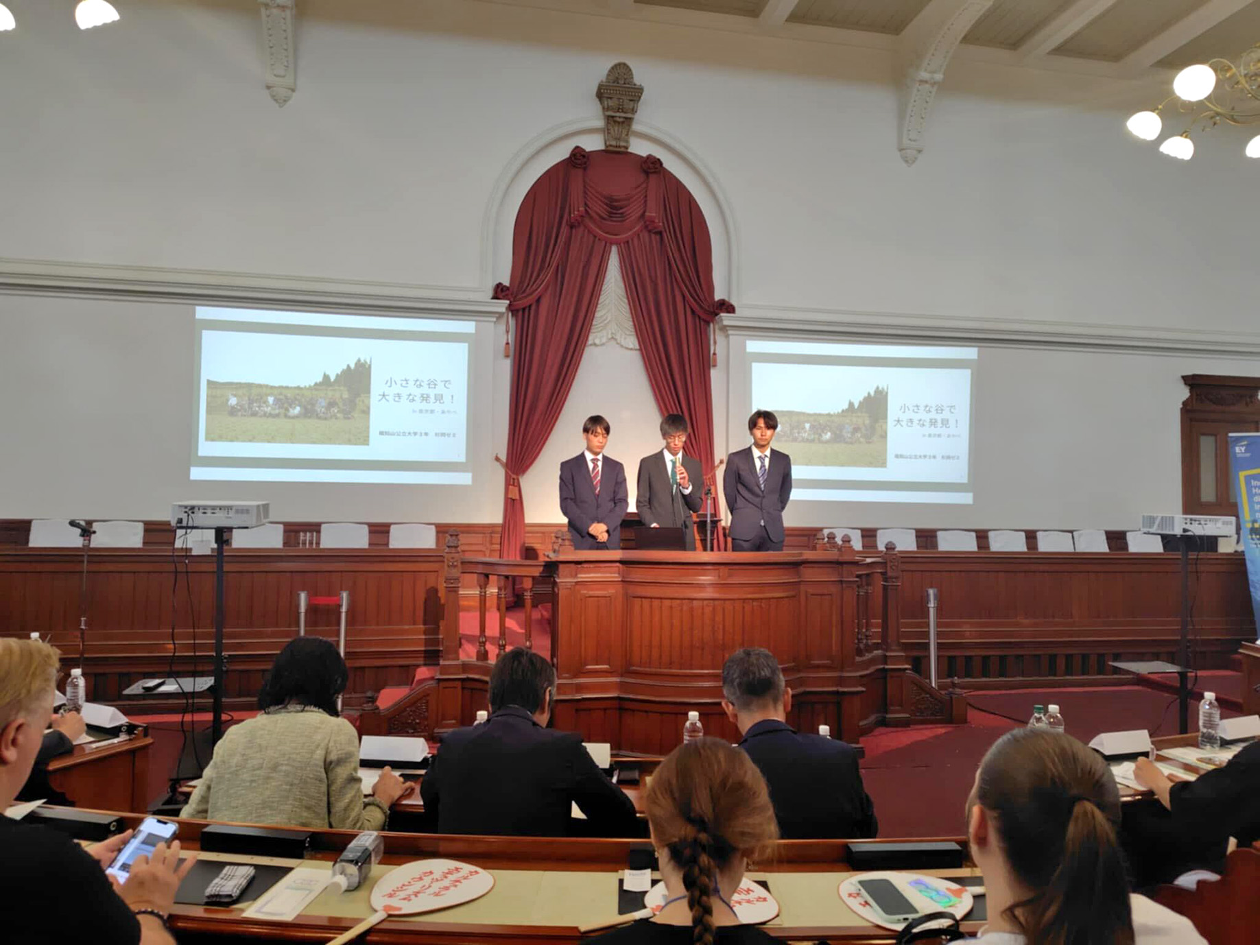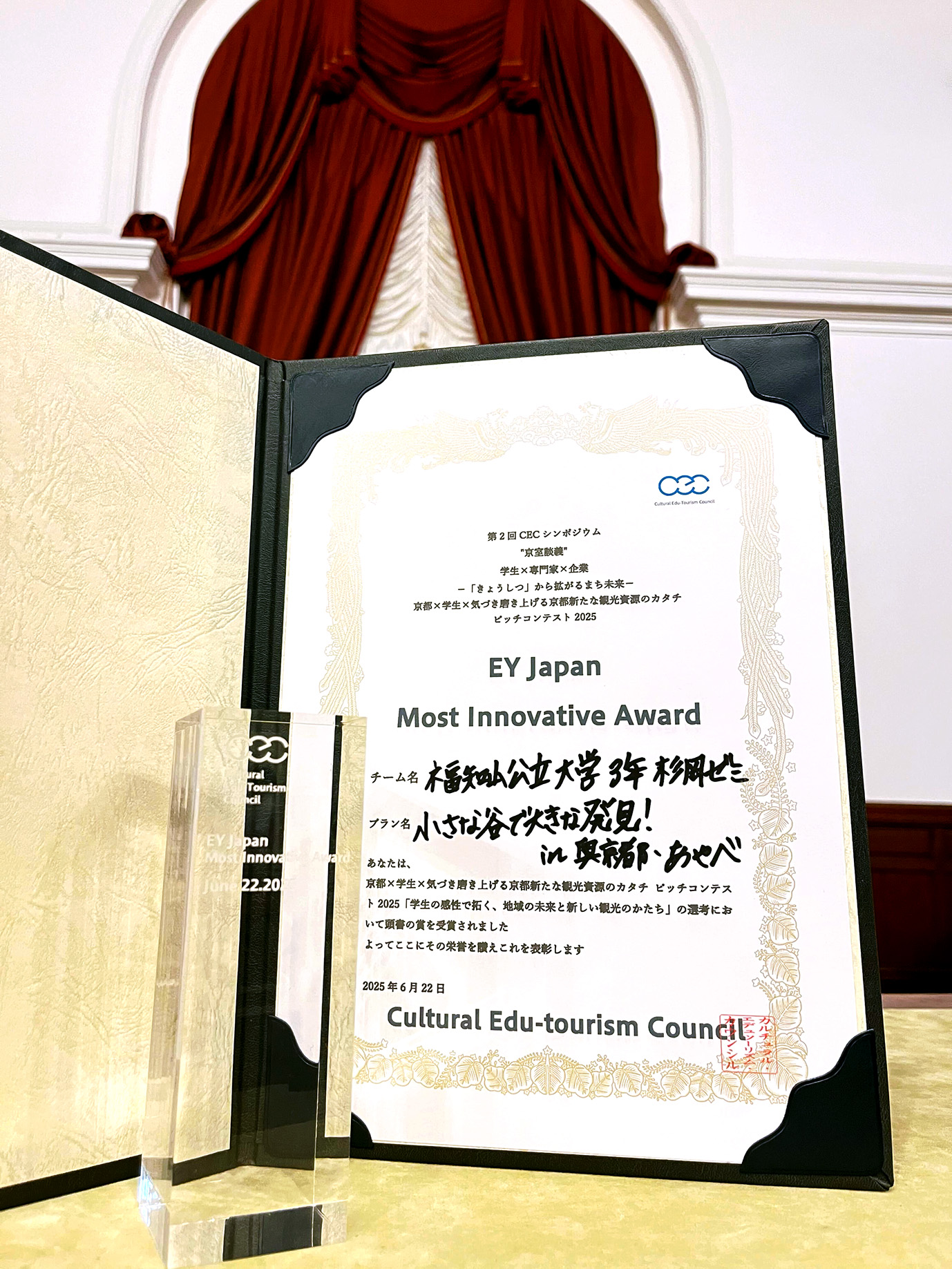 杉岡ゼミは、「小さな谷で大きな発見!in 奥京都・あやべ」をテーマに、綾部市志賀郷での活動を紹介したうえで、都市部のファミリー層を対象に、里山の暮らしを体験できる観光ツアーの企画を発表。最終審査ではその革新的なアイデアが高く評価され、「EY Japan Most Innovative Award」を受賞しました。