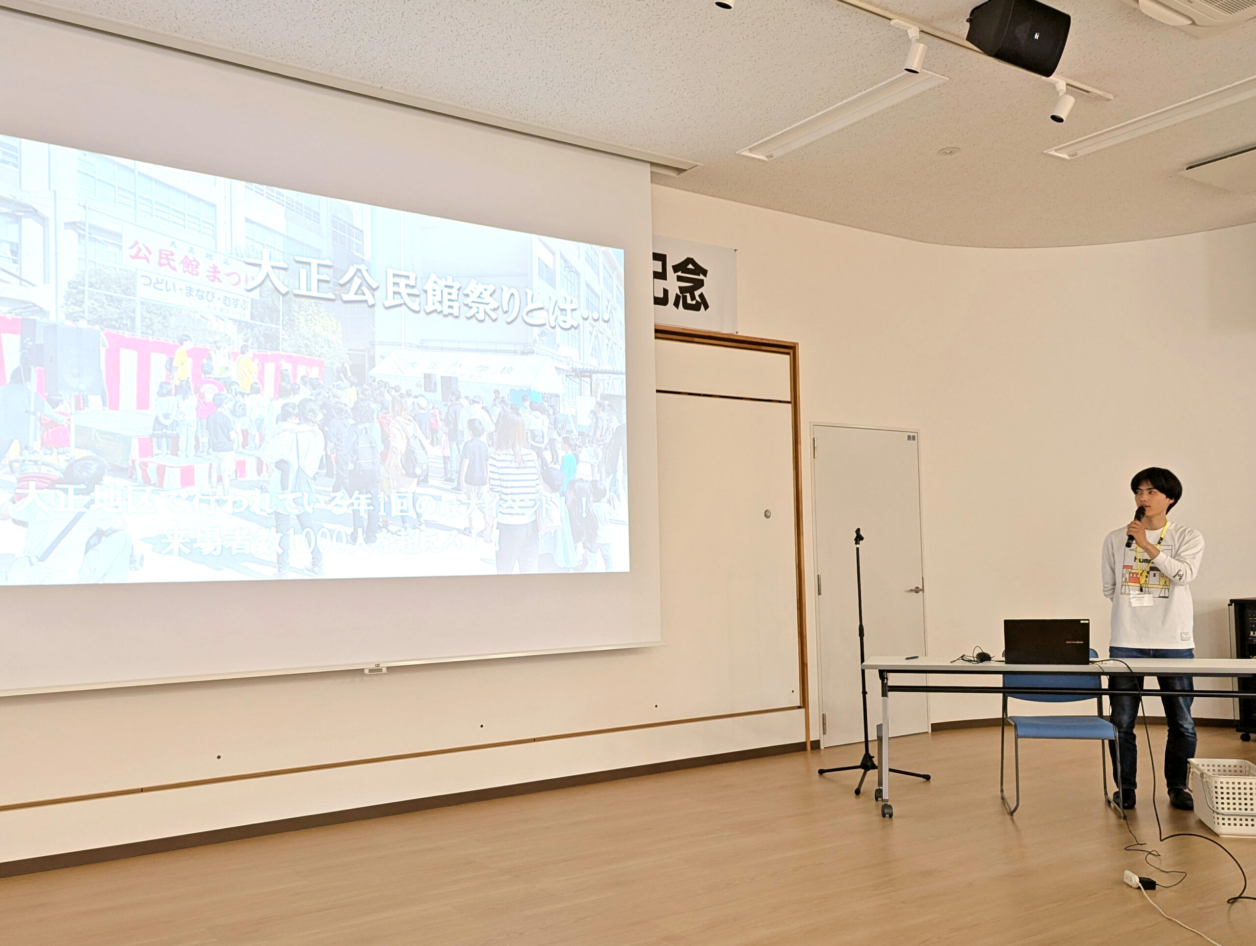 続いて、小山教授のゼミ生である武郷太喜さん(同学部3年生)が一昨年の大正公民館まつりでの催し企画や、昨年度の運営支援についての報告を行いました。