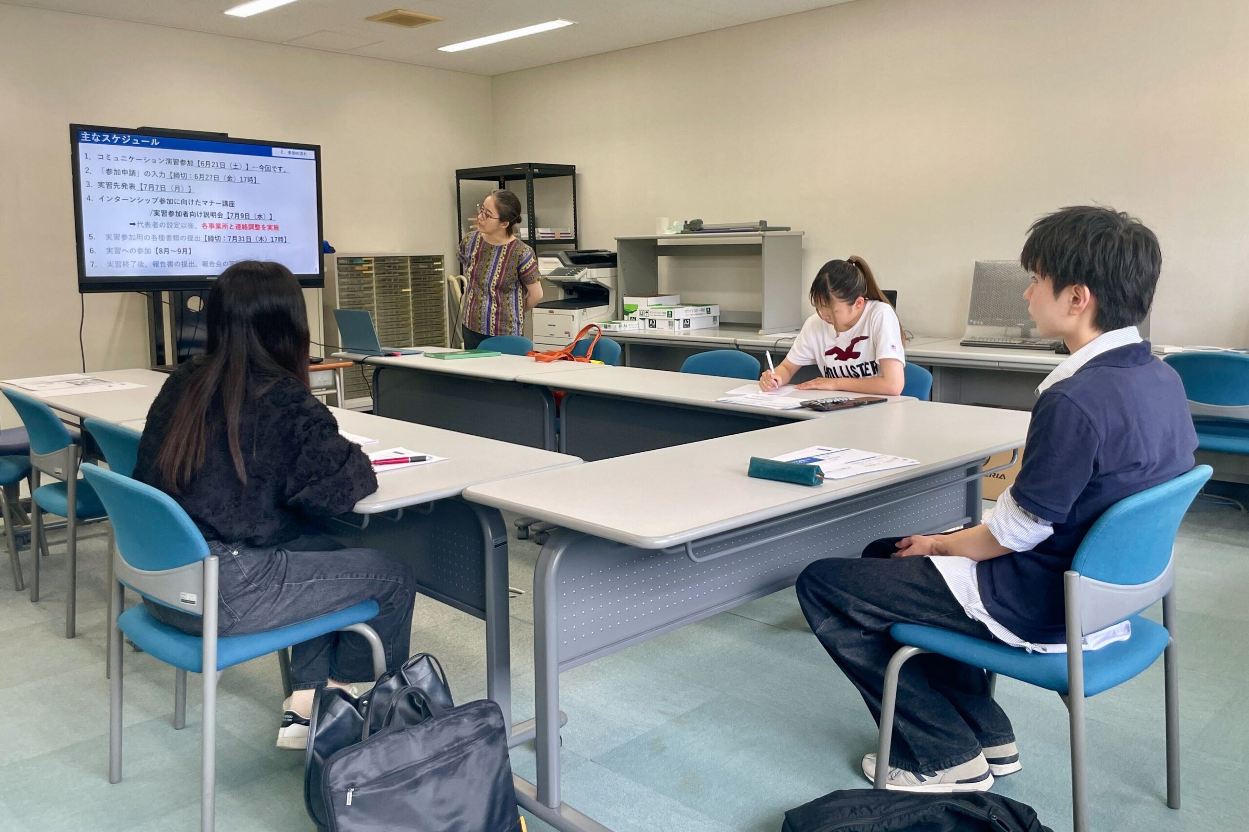 地域経営学部の大谷杏准教授が登壇し、「地域キャリア実習」の概要や参加方法、単位修得までの流れ、今後のスケジュールなどについて説明しました。地域キャリア実習は「コミュニケーション演習」の一部として位置づけており、今後学生は「地域キャリア実習」でのインターンシップ活動を経て、「初級地域公共政策士」の資格取得をめざします。
