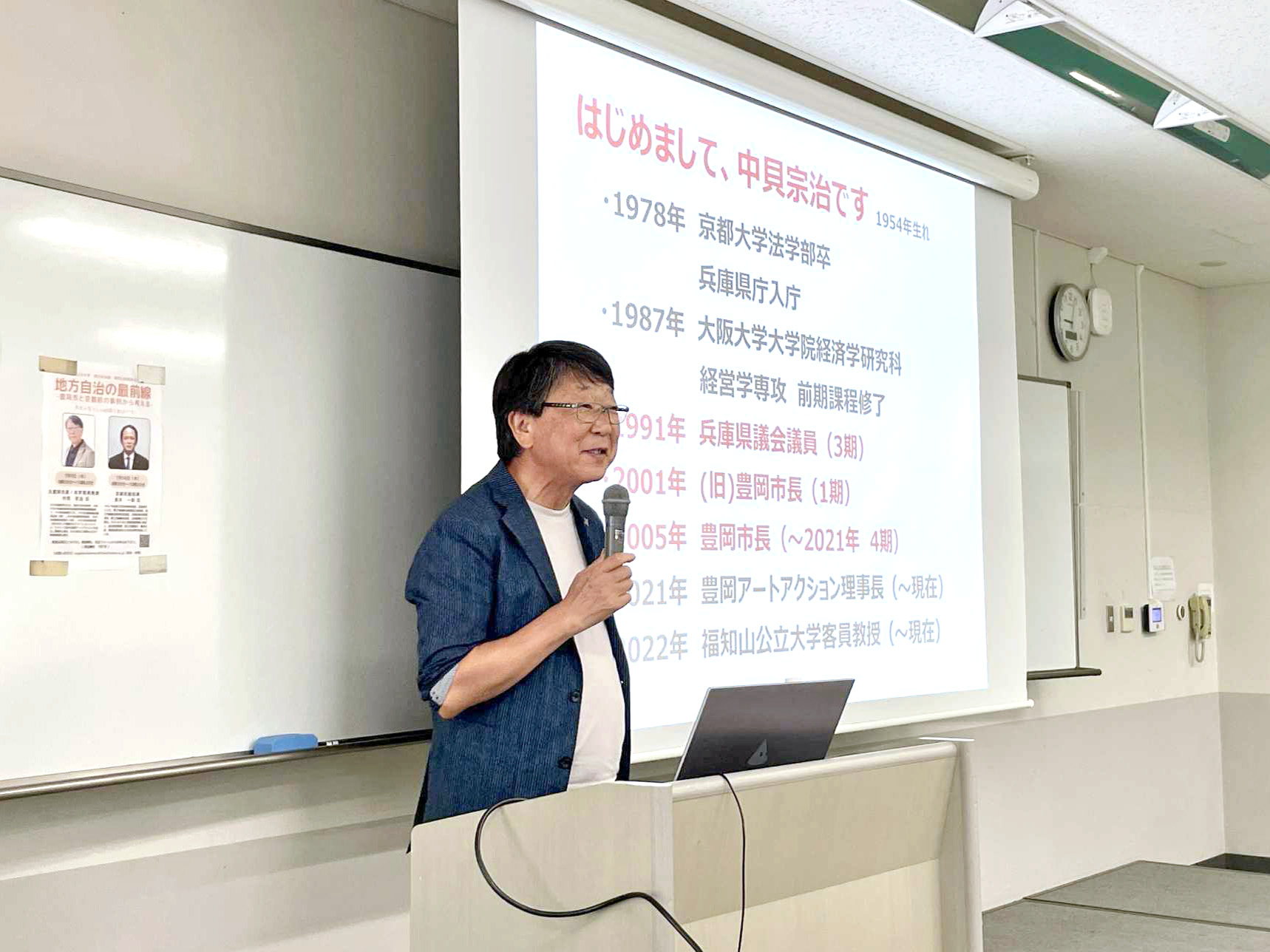 2025年7月9日(水)、地域経営学部の講義「地方自治論」(担当:杉岡秀紀准教授)の一環として、特別公開講座「地方自治の最前線-豊岡市と京都府の事例から考える-」を本学で開催し、前豊岡市長で本学客員教授の中貝宗治氏に、ゲストスピーカーとしてご登壇いただきました。