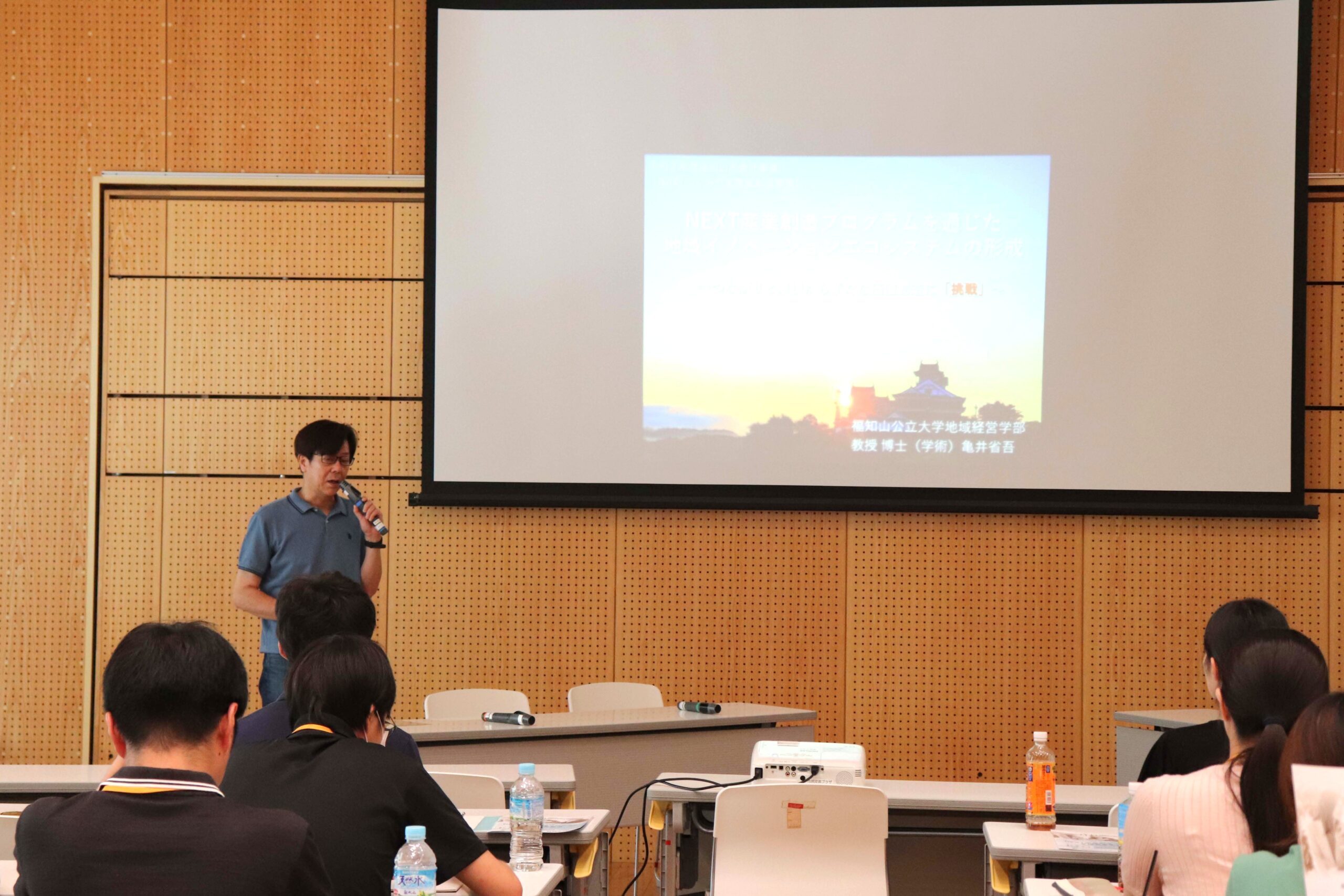 当日は、京都府や府内市町村職員らの参加のもと、大学と自治体の連携取組事例として、「NEXT産業創造プログラムを通じた地域イノベーションエコシステムの形成」をテーマに、亀井教授が基調講演を実施しました。その後、福知山市の産業政策について、福知山市産業課から講演がありました。続くパネルセッションでは、同プログラム修了生である菅谷さんを交えて、参加者と意見交換が行われました。