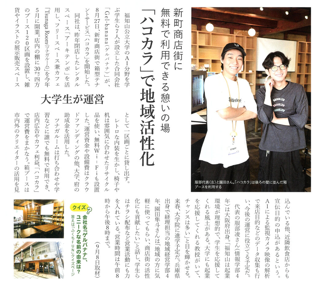 京都新聞(2025年7月30日付)、両丹日日新聞(2025年8月2日付)、朝日新聞(2025年8月3日付)、地元情報誌「ラサンカ」(2025年10月号・9月23日発行)で、本学学生が運営する合同会社「Gel-banana」による新プロジェクト「ハコカラ」について紹介されました。