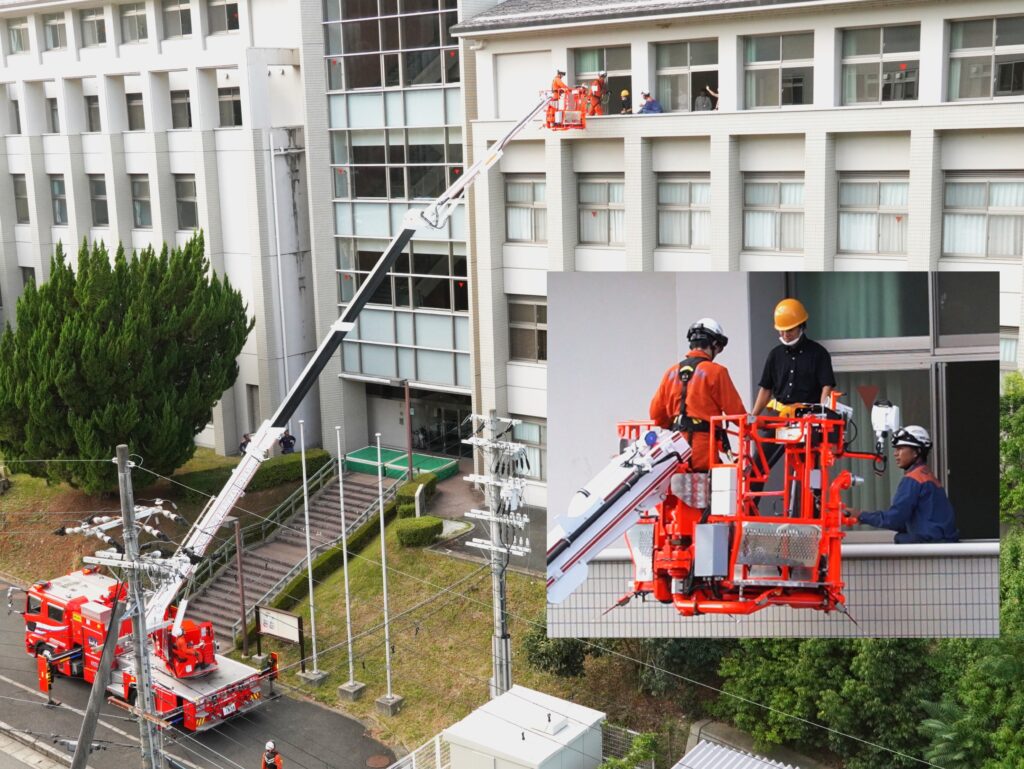今回の避難訓練では、学生の誘導のために逃げ遅れた職員1名が発生した想定で「屈折はしご付きポンプ車」が出動し、校舎前のポールや木々を回避しながらはしごを伸ばし、要救助者の救出訓練が行われました。