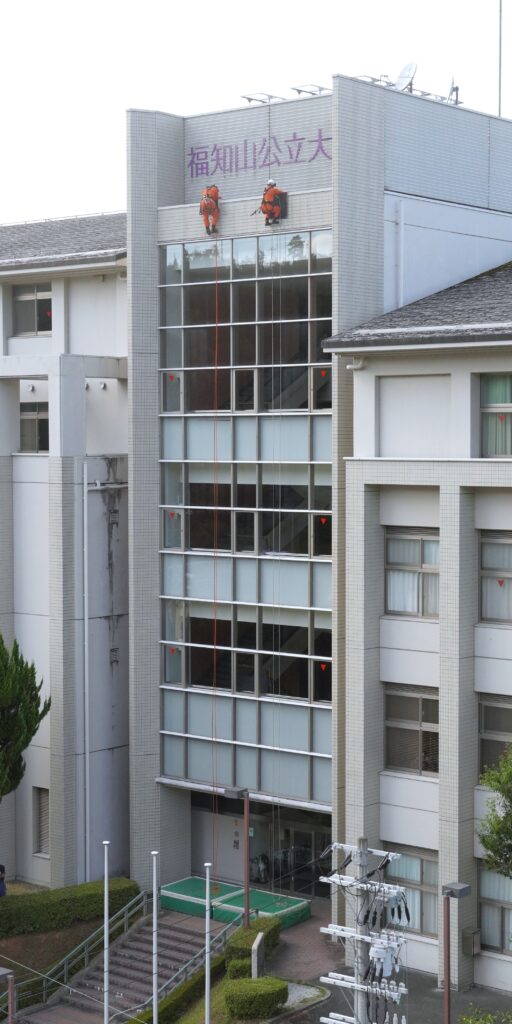 また、消防士の方による屋上からロープでの降下の訓練を見学させていただきました。