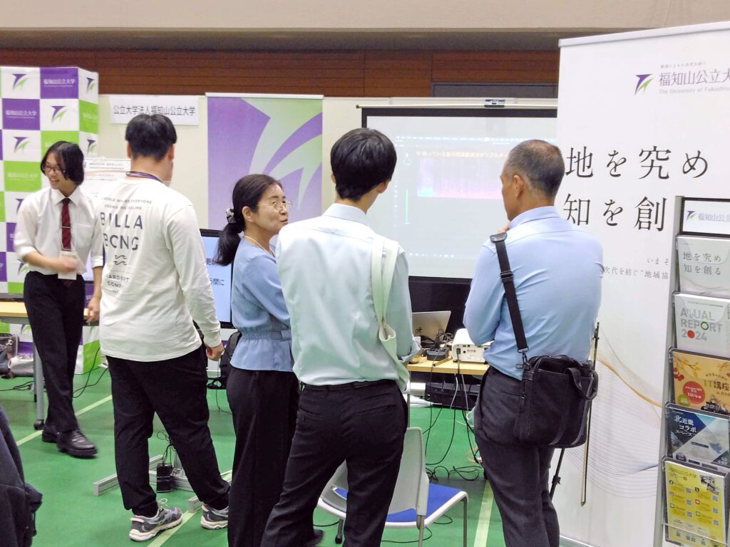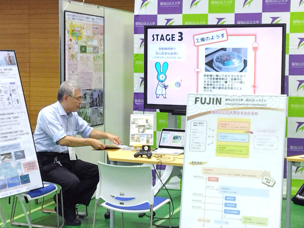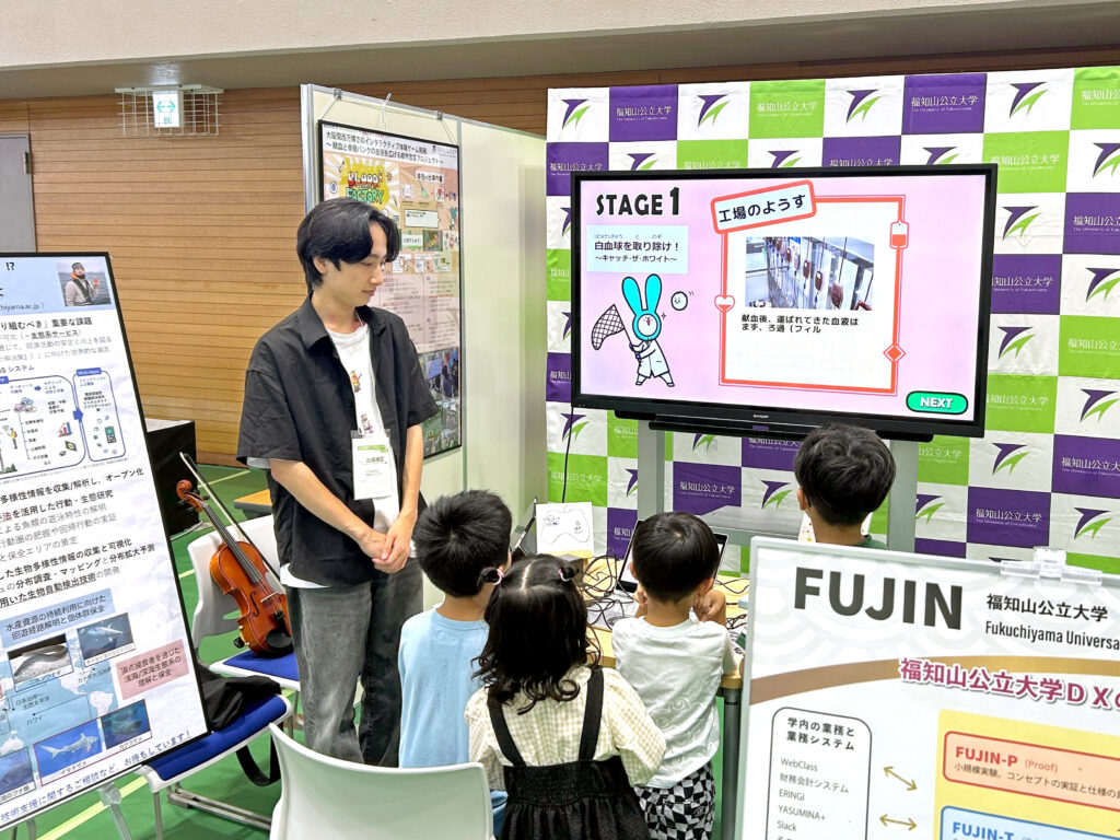 本学のブースでは、自分の声に自動でハモリを合わせてくれる自動ハモリ機(橋田光代准教授)や、省力化を実現するデジタルサイネージの紹介(衣川昌宏准教授)、さらに大阪・関西万博でも出展された、献血や骨髄バンク支援の普及を目的としたインタラクティブゲームの開発(倉本到教授)、大学全体のDX推進に関する取り組み(公手敏裕DXアシスタントオフィサー)などを紹介しました。