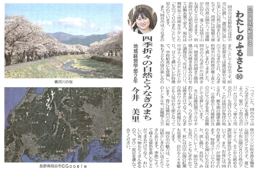 両丹日日新聞に今井美里さん(2年生)の記事が掲載されました レポート 2025.10.03 両丹日日新聞(2025年9月30日付け)に、「公立大生が紹介する“わたしのふるさと Vol.80”」として、今井美里さん(地域経営学部2年生)の記事が掲載されました。記事では、今井さんの出身地・長野県岡谷市の特産であるうなぎや、「寒の土用の丑の日」という珍しい習慣について紹介しています。 (両丹日日新聞社提供・無断複製及び転載を禁じます) 前回の記事はこちら ツイート