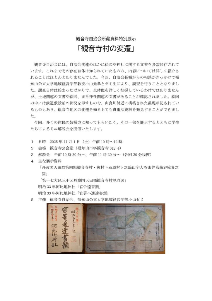 2025年11月1日(土)、観音寺自治会と地域経営学部小山ゼミ主催で観音寺自治会所蔵資料の特別展示とミニ解説会を開催します。