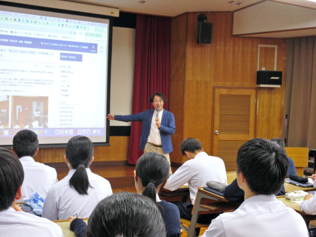 本授業は毎年1回実施されており、同校普通科1年生52名に加えて、教員も参加しました。当日は、杉岡准教授が「探究学習のデザイン ― 問題・問い・情報収集のポイント ―」と題した参加型の講演を行い、生徒たちは熱心にメモを取りながら受講しました。